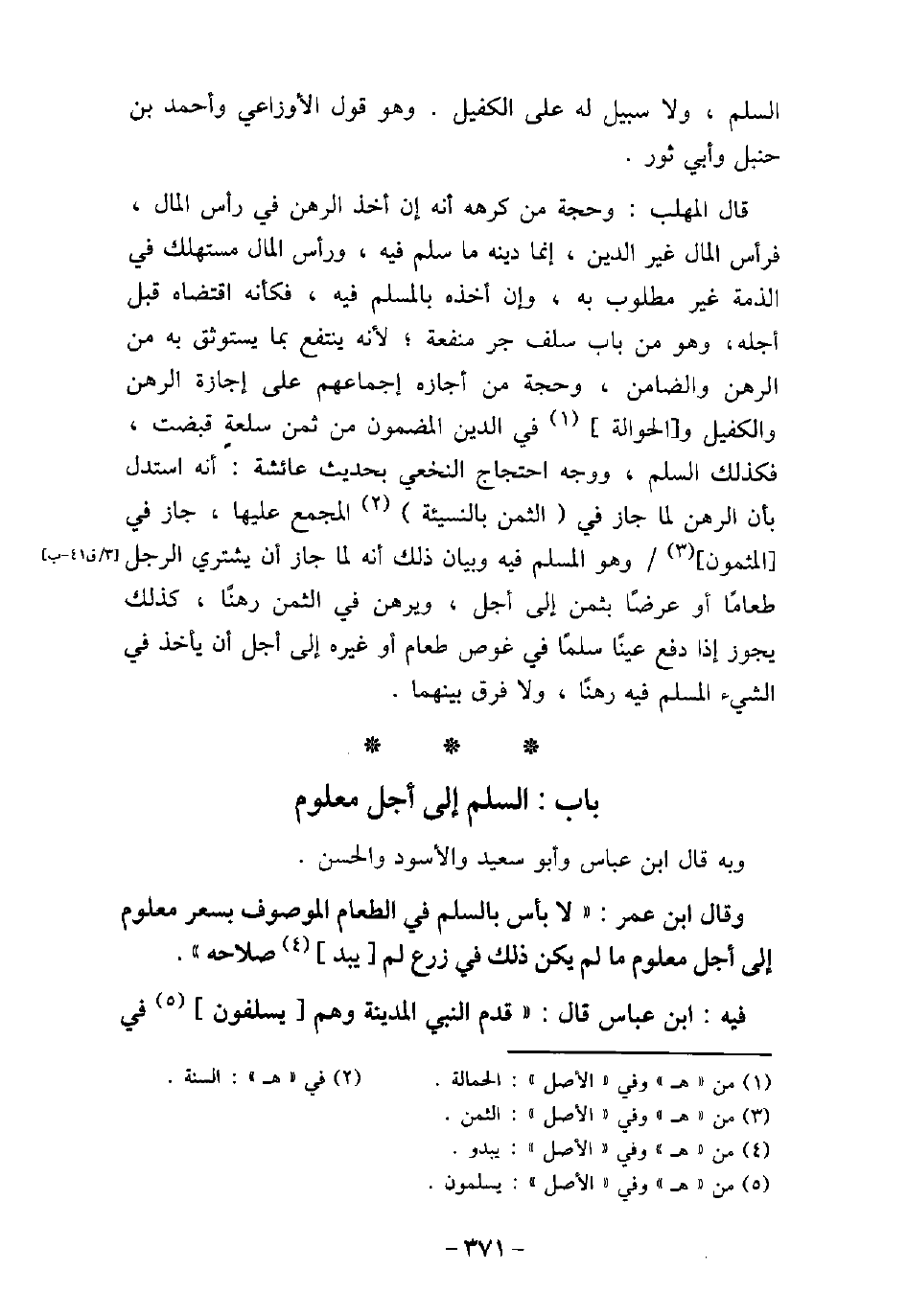 وَبِهِ قَالَ ابْنُ عَبَّاسٍ، وَأَبُو سَعِيدٍ، وَالأَسْوَدُ، وَالْحَسَنُ. وَقَالَ ابْنُ عُمَرَ: لاَ بَأْسَ بالسلم فِى الطَّعَامِ الْمَوْصُوفِ بِسِعْرٍ مَعْلُومٍ إِلَى أَجَلٍ مَعْلُومٍ، مَا لَمْ يَكُ ذَلِكَ فِى زَرْعٍ لَمْ يَبْدُ صَلاَحُهُ. / 8 - فيه: ابْن عَبَّاس، قَالَ: قَدِمَ النَّبِىُّ (صلى الله عليه وسلم) وَهُمْ يُسْلِفُونَ فِى