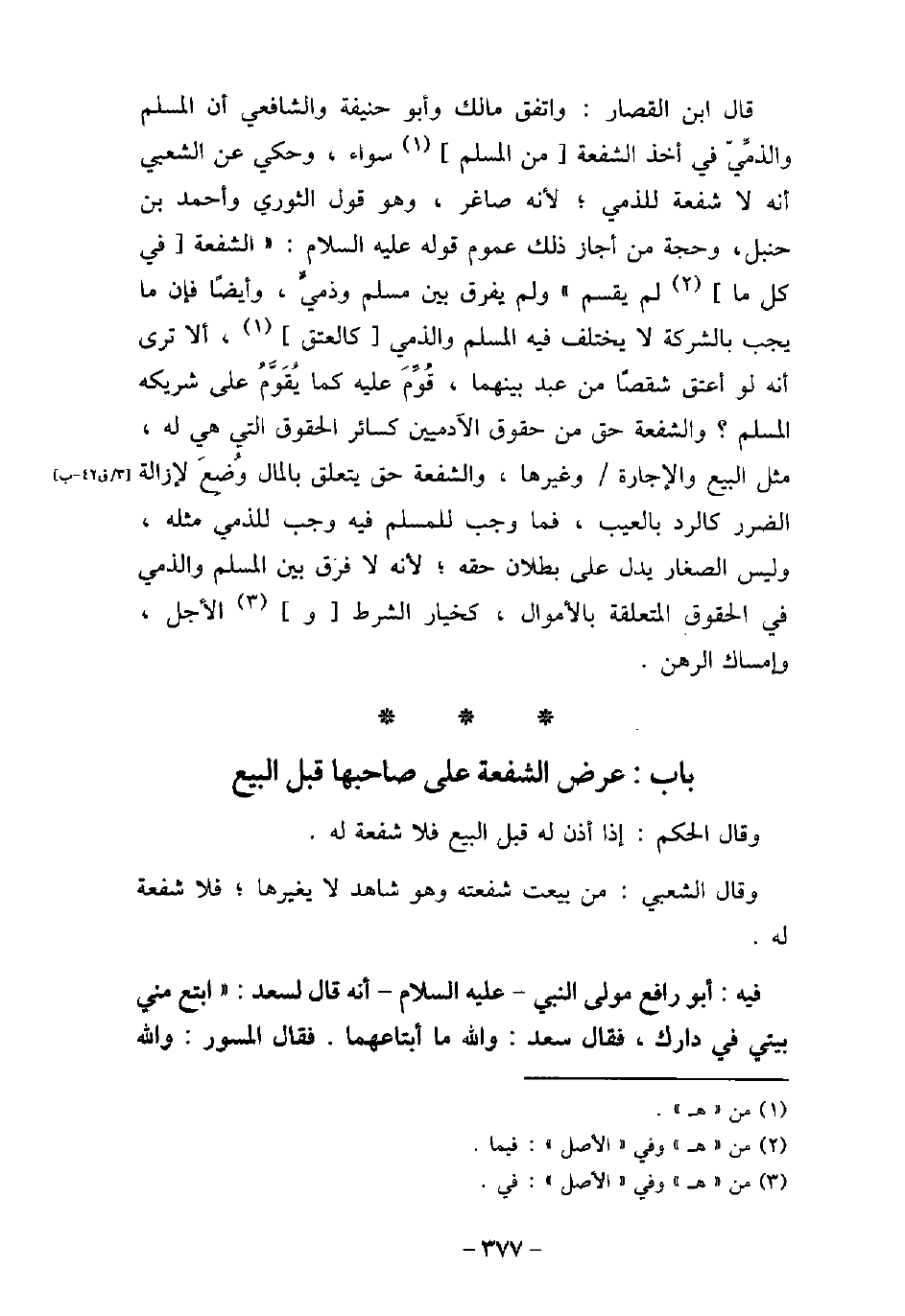 وَقَالَ الْحَكَمُ: إِذَا أَذِنَ لَهُ قَبْلَ الْبَيْعِ فَلاَ شُفْعَةَ لَهُ. وَقَالَ الشَّعْبِىُّ: مَنْ بِيعَتْ شُفْعَتُهُ، وَهْوَ شَاهِدٌ لاَ يُغَيِّرُهَا، فَلاَ شُفْعَةَ لَهُ. / 2 - فيه: أَبُو رَافِعٍ، مَوْلَى النَّبِىِّ، عليه السَّلام، أنه قَالَ لسعد: ابْتَعْ مِنِّى بَيْتَىَّ فِى دَارِكَ؟ فَقَالَ سَعْدٌ: وَاللَّهِ مَا أَبْتَاعُهُمَا، فَقَالَ الْمِسْوَرُ: وَاللَّهِ