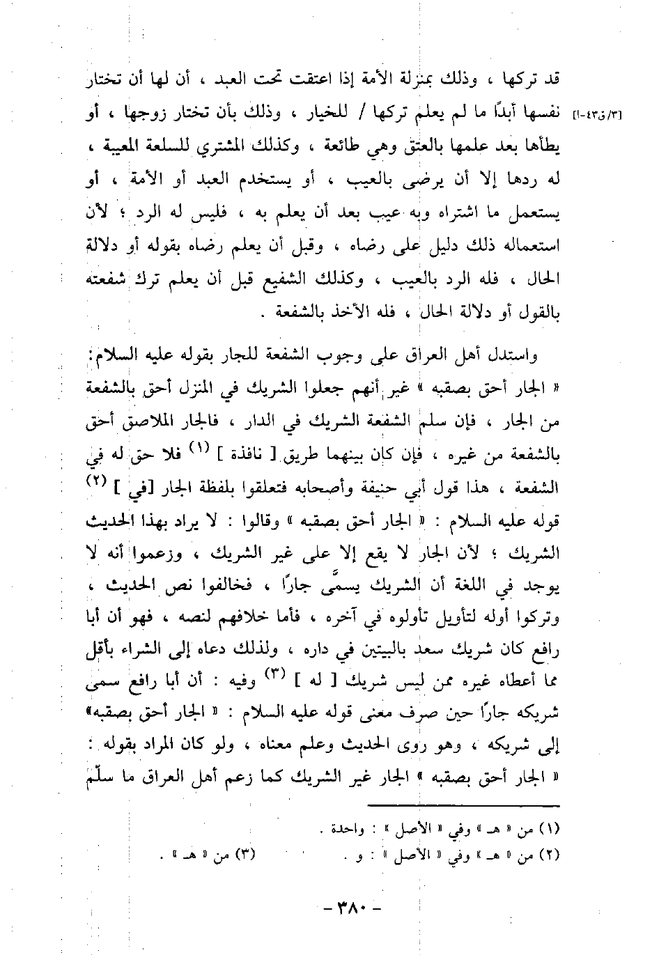 قد تركها، وذلك بمنزلة الأمة إذا أعتقت تحت العبد، أن لها أن تختار نفسها أبدًا ما لم يعلم تركها للخيار، وذلك بأن تختار زوجها، أو يطأها بعد علمها بالعتق وهى طائعة، وكذلك المشترى للسلعة المعيبة، له ردها إلا إن يرضى بالعيب، أو يستخدم العبد أو الأمة، أو يستعمل ما اشتراه وبه عيب بعد أن يعلم به، فليس له الرد؛ لأن استعماله ذلك دليل على رضاه، وقبل أن يعلم رضاه بقوله أو دلالة الحال، فله الرد بالعيب، وكذلك الشفيع قبل أن يعلم ترك شفعته بالقول أو دلالة الحال، فله الأخذ بالشفعة. واستدل أهل العراق على وجوب الشفعة للجار بقوله عليه السلام: (الجار أحق بصقبه) غير أنهم جعلوا الشريك فى المنزل أحق بالشفعة من الجار، فإن سلم الشفعة الشريك فى الدار، فالجار الملاصق أحق بالشفعة من غيره، فإنت كان بينهما طريق نافذة فلا حق له فى الشفعة، هذا قول أبى حنيفة وأصحابه فتعلقوا بلفظة الجار فى قوله عليه السلام: (الجار أحق بصبقه) وقالوا: لا يراد بهذا الحديث الشريك؛ لأن الجار لا يقع إلا على غير الشريك، وزعموا أنه لا يوجد فى اللغة أن الشريك يسمى جارًا، فخالفوا نص الحديث، وتركوا أوله لتأويل تأولوه فى آخره، فأما خلافهم لنصه، فهو أن أبا رافع كان شريك سعد بالبيتين فى داره، ولذلك دعاه إلى الشراء بأقل مما أعطاه غيره ممن ليس شريك له وفيه: أن أبا رافع سمى شريكه جارًا حين صرف معنى قوله عليه السلام: (الجار أحق بصقبه) إلى شريكه، وهو روى الحديث وعلم معناه، ولو كان المراد بقوله: (الجار أحق بصقبه) الجار غير الشريك كما زعم أهل العراق ما سلم
