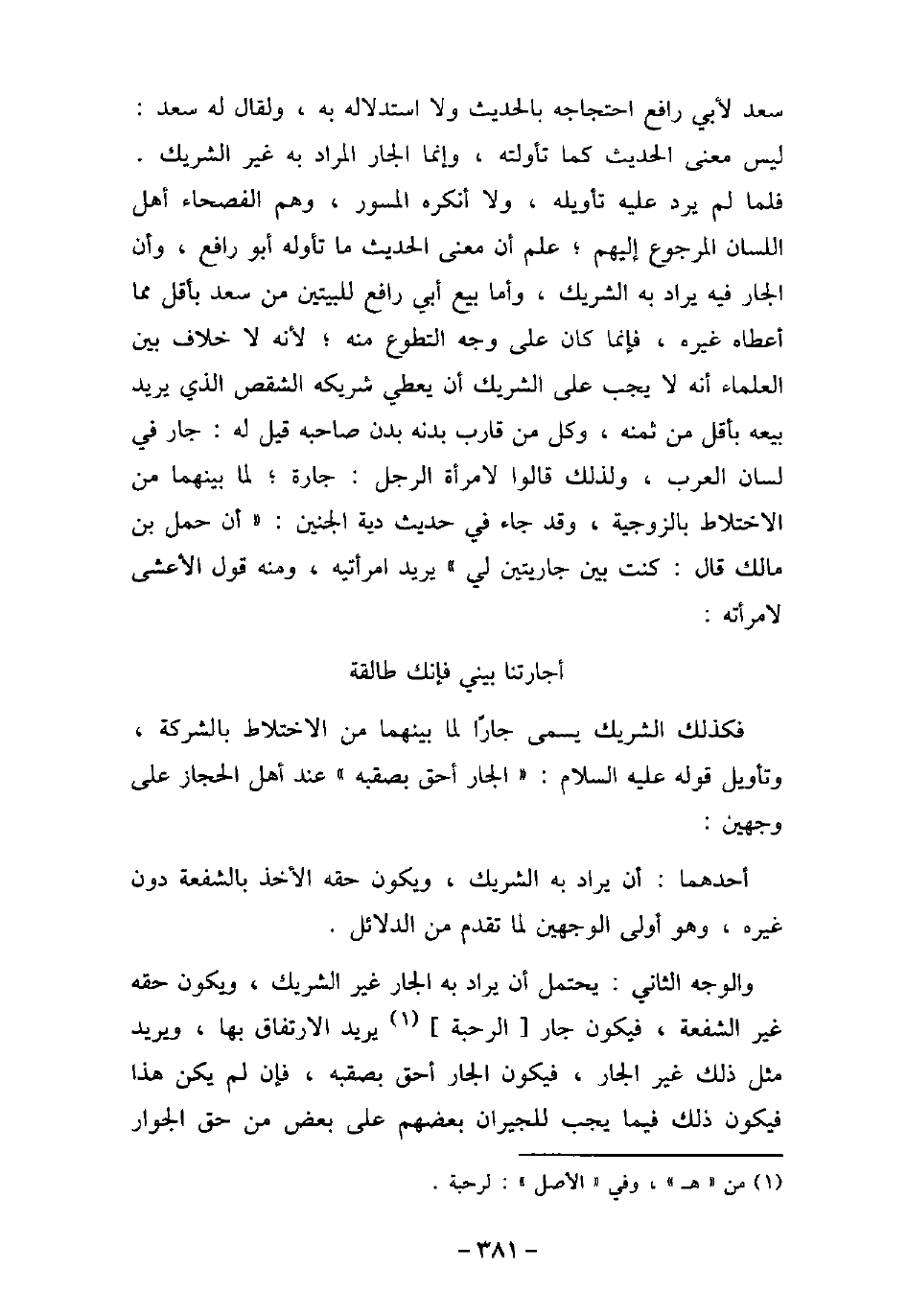 سعد لأبى رافع احتجاجه بالحديث ولا استدلاله به، ولقال له سعد: ليس معنى الحديث كما تأولته، وإنما الجار المراد به غير الشريك. فلما لم يرد عليه تأويله، ولا أنكره المسور، وهم الفصحاء أهل اللسان المرجوع إليهم؛ علم أن معنى الحديث ما تأوله أبو رافع، وأن الجار فيه يراد به الشريك، وأما بيع أبى رافع للبيتين من سعد بأقل مما أعطاه غيره، فإنما كان على وجه التطوع منه؛ لأنه لا خلاف بين العلماء أنه لا يجب على الشريك أن يعطى شريكه الشقص الذى يريد بيعه بأقل من ثمنه، وكل منا قارب بدنه بدن صاحبه قيل له: جار فى لسان العرب، ولذلك قالوا لامرأة الرجل: جارة؛ لما بينهما من الاختلاط بالزوجية، وقد جاء فى حديث دية الجنين: (أن حمل بن مالك قال: كنت بين جارتين لى) يريد امرأيته، ومنه قول الأعشى لامرأته: أجارتنا بينى فإنك طالقة فكذلك الشريك يسمى جارًا لما بينهما من الاختلاط بالشركة، وتأويل قوله عليه السلام: (الجار أحق بصقبه) عند أهل الحجاز على وجهين: أحدهما: أن يراد به الشريك، ويكون حقه الأخذ بالشفعة دون غيره، وهو أولى الوجهين لما تقدم من الدلائل. والوجه الثانى: يحتمل أن يراد به الجار غير الشريك، ويكون حقه غير الشفعة، فيكون جار الرحبة يريد الارتفاق بها، ويريد مثل ذلك غير الجار، فيكون الجار أحق بصقبه، فإن لم يكن هذا فيكون ذلك فيما يجب للجيران بعضهم على بعض من حق الجوار
