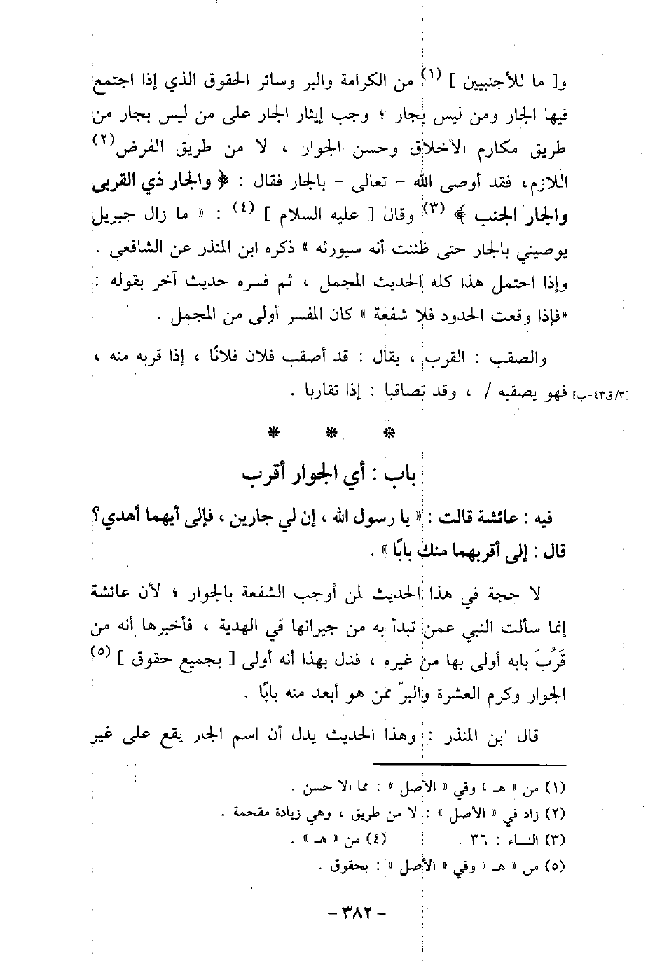 / 3 - فيه: عَائِشَةَ، قَالَتْ: يَا رَسُولَ اللَّهِ، إِنَّ لِى جَارَيْنِ، فَإِلَى أَيِّهِمَا أُهْدِى؟ قَالَ: (إِلَى أَقْرَبِهِمَا مِنْكِ بَابًا) . لا حجة فى هذا الحديث لمن أوجب الشفعة بالجوار، لأن عائشة إنما سألت النبى عمن تبدأ به من جيرانها فى الهدية، فأخبرها أنه من قرب بابه أولى بها من غيره، فدل بهذا أنه أولى بجميع حقوق الجوار وكرم العشرة والبر ممن هو أبعد منه بابًا. قال ابن المنذر: وهذا الحديث يدل أن اسم الجار يقع على غير