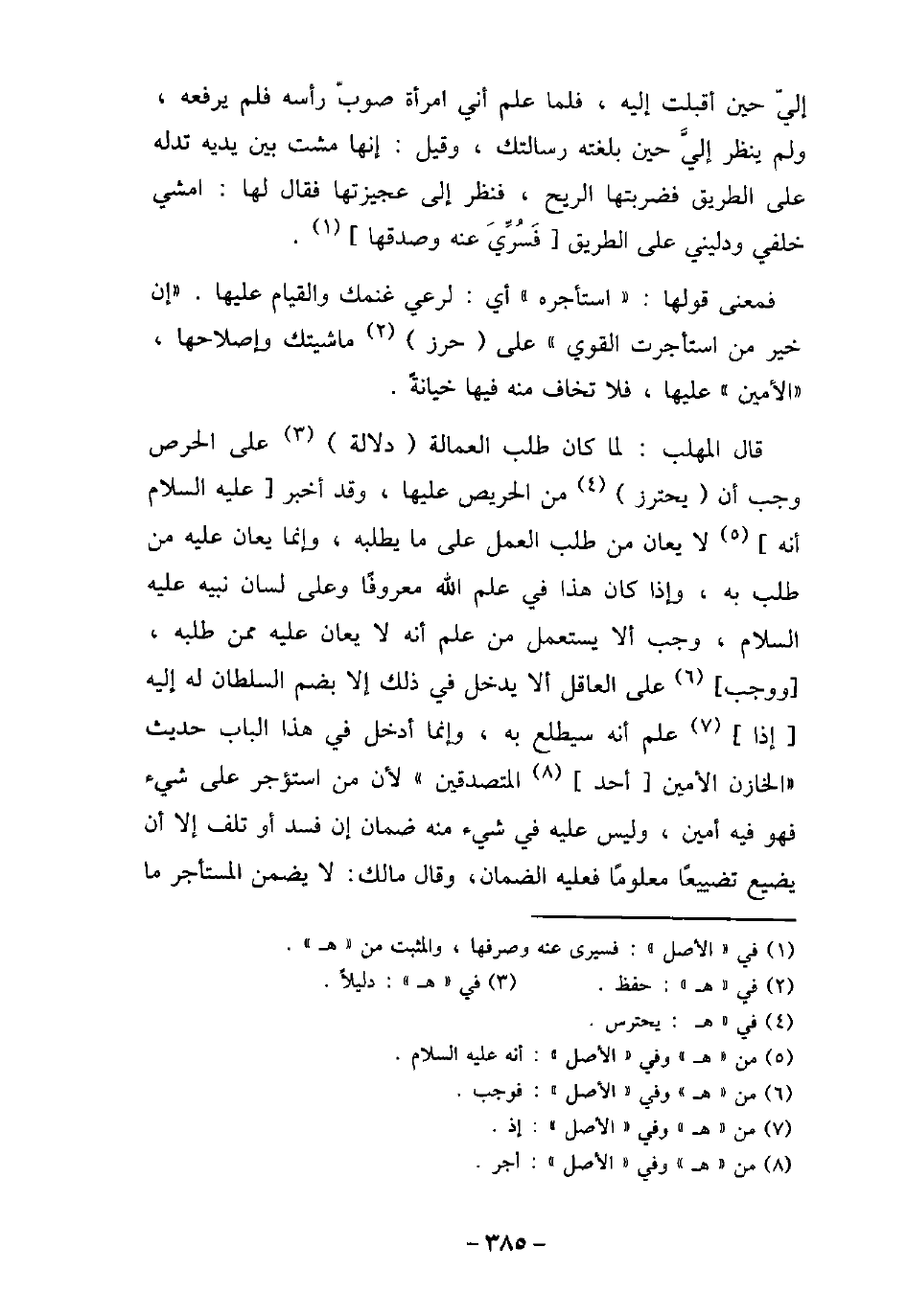 إلى حين أقبلت إليه، فلما علم أنى امرأة صوب رأسه فلم يرفعه، ولم ينظر إلى حين بلغته رسالتك، وقيل: إنها مشت بين يديه تدله على الطريق فضربتها الريح، فنظر إلى عجيزتها فقال لها: امشى خلفى ودلينى على الطريق فسرى عنه وصدقها. فمعنى قولها: (استأجره) أى: لرعى غنمك والقيام عليها. (إن خير من استأجرت القوى) على حرز ماشيتك وإصلاحها، (الأمين) عليه، فلا تخاف منه فيها خيانة. قال المهلب: لما كان طلب العمالة دلالة على الحرص وجب أن يحترز من الحريص عليها، وقد أخبر عليه السلام أنه لا يعان من طلب العمل على ما يطلبه، وإنما يعان عليه من طلب به، وإذا كان هذا فى علم الله معروفًا وعلى لسان نبيه عليه السلام، وجب ألا يستعمل من علم أنه لا يعان عليه ممن طلبه، ووجب على العاقل ألا يدخل فى ذلك إلا بضم السلطان له إليه إذا علم أنه سيطلع به، وإنما أدخل فى هذا الباب حديث (الخازن الأمين أحد المتصدقين) لأن من استؤجر على شىء فهو فيه أمين، وليس عليه فى شىء منه ضمان إن فسد أو تلف إلا أن يضيع تضييعًا معلومًا فعليه الضمان، وقال ملك: لا يضمن المستأجر