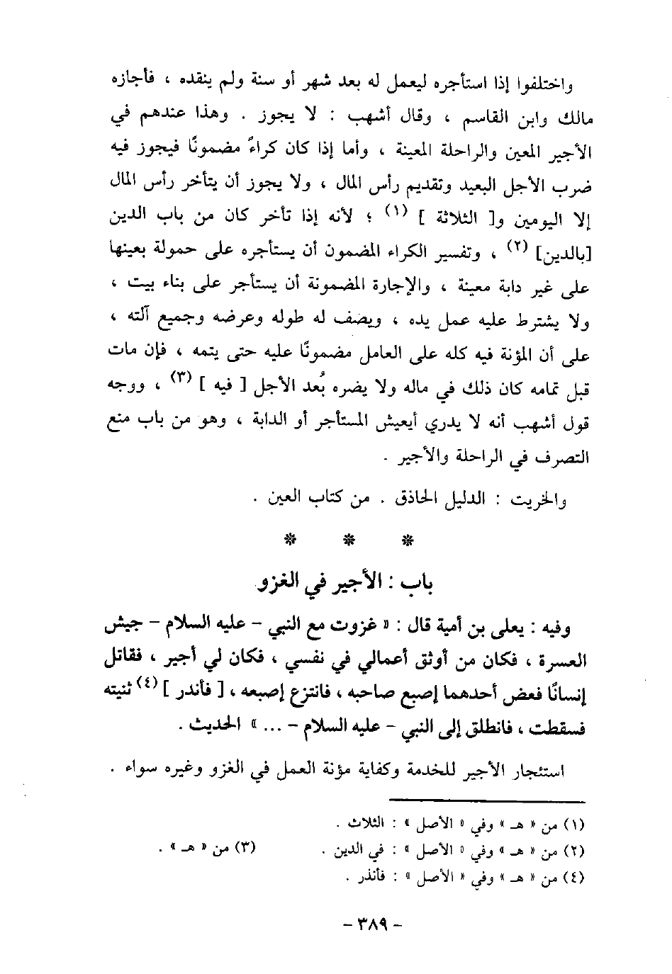 / 6 - وفيه: يَعْلَى بْنِ أُمَيَّةَ، قَالَ: غَزَوْتُ مَعَ النَّبِىِّ، عليه السَّلام، جَيْشَ الْعُسْرَةِ، فَكَانَ مِنْ أَوْثَقِ أَعْمَالِى فِى نَفْسِى، فَكَانَ لِى أَجِيرٌ، فَقَاتَلَ إِنْسَانًا، فَعَضَّ أَحَدُهُمَا إِصْبَعَ صَاحِبِهِ، فَانْتَزَعَ إِصْبَعَهُ، فَأَنْدَرَ ثَنِيَّتَهُ فَسَقَطَتْ، فَانْطَلَقَ إِلَى النَّبِىِّ، عليه السلام. . . الحديث. استئجار الأجير للخدمة وكفاية مؤنة العمل فى الغزو وغيره سواء.