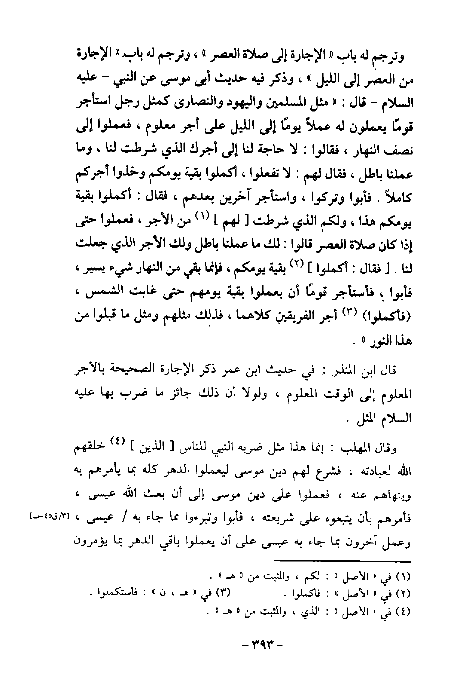 وترجم له (باب الإجارة إلى صلاة العصر) ، وترجم له (باب الإجارة من العصر إلى الليل) . / 9 - وذكر فيه حديث أَبُو مُوسَى، عَنِ النَّبِىِّ، عليه السَّلام، قَالَ: (مَثَلُ الْمُسْلِمِينَ وَالْيَهُودِ وَالنَّصَارَى، كَمَثَلِ رَجُلٍ اسْتَأْجَرَ قَوْمًا يَعْمَلُونَ لَهُ عَمَلاً يَوْمًا إِلَى اللَّيْلِ عَلَى أَجْرٍ مَعْلُومٍ، فَعَمِلُوا لَهُ إِلَى نِصْفِ النَّهَارِ، فَقَالُوا: لاَ حَاجَةَ لَنَا إِلَى أَجْرِكَ الَّذِى شَرَطْتَ لَنَا، وَمَا عَمِلْنَا بَاطِلٌ، فَقَالَ لَهُمْ: لاَ تَفْعَلُوا، أَكْمِلُوا بَقِيَّةَ عَمَلِكُمْ وَخُذُوا أَجْرَكُمْ كَامِلاً، فَأَبَوْا وَتَرَكُوا، وَاسْتَأْجَرَ أَجِيرَيْنِ بَعْدَهُمْ، فَقَالَ: أَكْمِلوا بَقِيَّةَ يَوْمِكُمَ هَذَا وَلَكُمَا الَّذِى شَرَطْتُ لَهُمْ مِنَ الأَجْرِ، فَعَمِلُوا حَتَّى إِذَا كَانَ صَلاَةِ الْعَصْرِ، قَالوا: لَكَ مَا عَمِلْنَا بَاطِلٌ وَلَكَ الأَجْرُ الَّذِى جَعَلْتَ لَنَا فِيهِ، فَقَالَ: أَكْمِلوا بَقِيَّةَ يَومِكُم، مَا بَقِىَ مِنَ النَّهَارِ شَىْءٌ يَسِيرٌ فَأَبَوا، فَاسْتَأْجَرَ قَوْمًا أَنْ يَعْمَلُوا لَهُ بَقِيَّةَ يَوْمِهِمْ، [فَعَمِلُوا بَقِيَّةَ يَوْمِهِمْ] حَتَّى غَابَتِ الشَّمْسُ، فَاكْمَلُوا أَجْرَ الْفَرِيقَيْنِ كِلَيْهِمَا، فَذَلِكَ مَثَلُهُمْ وَمَثَلُ مَا قَبِلُوا مِنْ هَذَا النُّورِ) . قال ابن النذر: فى حديث ابن عمر ذكر الإجارة الصحيحة بالأجر المعلوم إلى الوقت المعلوم، ولولا أن ذلك جائز ما ضرب بها عليه السلام المثل. وقال المهلب: إنما هذا مثل ضربه النبى للناس الذين خلقهم الله لعبادته، فشرع لهم دين موسى ليعملوا الدهر كله بما يأمرهم به وينهاهم عنه، فعملوا على دين موسى إلى أن بعث الله عيسى، فأمرهم بأن يتبعوه على شريعته، فأبوا وتبرءوا مما جاء به عيسى، وعمل آخرون بما جاء به عيسى على أن يعملوا باقى الدهر بما يؤمرون