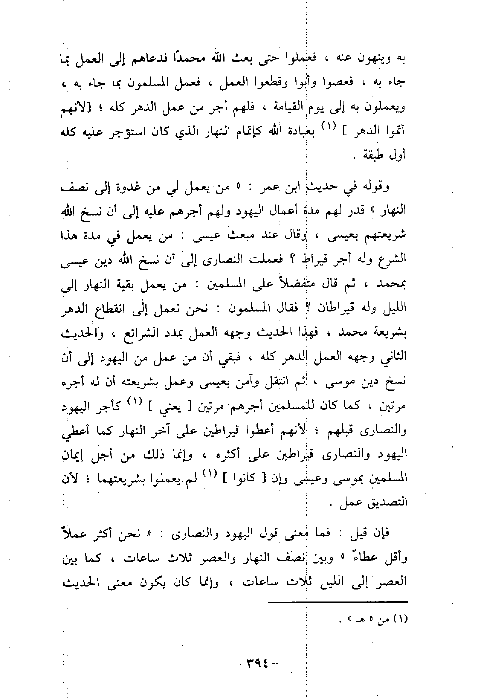 به وينهون عنه، فعملوا حتى بعث الله محمداُ فدعاهم إلى العمل بما جاء به، فعصوا وأبوا وقطعوا العمل، فعمل المسلمون بما جاء به، ويعملون به إلى يوم القيامة، فلهم أجر من عمل الدهر كله، لأنهم أتموا الدهر بعبادة الله كإتمام النهار الذى كان استؤجر عليه كله أول طبقة. وقوله فى حديث ابن عمر: (من يعمل لى من غدوة إلى نصف النهر) قدر لهم مدة أعمال اليهود ولهم أجرهم عليه إلى أن نسخ الله شريعتهم بعيسى، وقال عند مبعث عيسى: من يعمل فى مدة هذا الشرع وله أجر قيراط؟ فعملت النصارى إلى أن نسخ الله دين عيسى بمحمد، ثم قال متفضلاً على المسلمين: من يعمل بقية النهار إلى الليل وله قيراطان فقال المسلمون: نحن نعمل إلى انقطاع الدهر بشريعة محمد، فهذا الحديث وجهه العمل بمدد الشرائع، والحديث الثانى وجهه العمل الدهر كله، فبقى أن من عمل من اليهود إلى أن نسخ دين موسى، ثم انتقل وآمن بعيسى وعمل بشريعته أن له أجره مرتين، كما كان للمسلمين أجرهم مرتين يعنى كأجر اليهود والنصارى قبلهم، لأنهم أعطوا قيراطين على أكثره، وإنما ذلك من أجل إيمان المسلمين بموسى وعيسى وإن كانوا لم يعملوا بشريعتهما، لأن التصديق عمل. فإن قيل: فما قول اليهود والنصارى: (نحن أكثر عملاً وأقل عطاء) وبين نصف النهار والعصر ثلاث ساعات، كما بين العصر إلى الليل ثلاث ساعات، وإنما كان يكون معنى الحديث