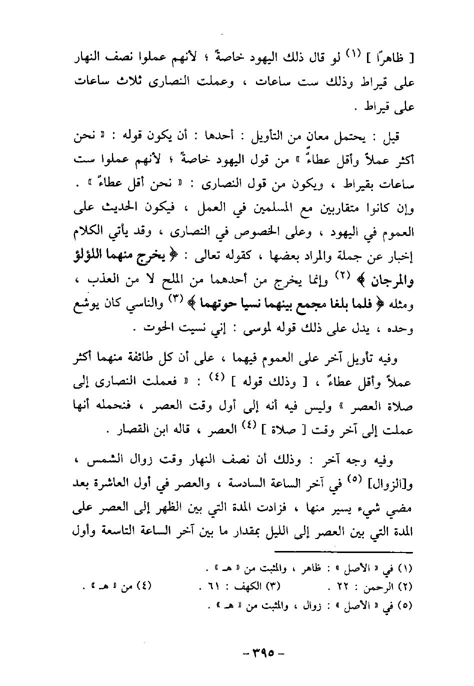 ظاهرًا لو قال ذلك اليهود خاصة، لأنهم عملوا نصف النهار على قيراط وذلك ست ساعات، وعملت النصارى ثلاث ساعات على قيراط. قيل: يحتمل معان من التأويل: أحدها: أن يكون قوله: (نحن أكثر عملاً وأقل عطاء) من قول اليهود خاصة، لأنهم عملوا ست ساعات بقيراط، ويكون من قول النصارى: (نحن أقل عطاء) . وإن كانوا متقاربين مع المسلمين فى العمل، فيكون الحديث على العموم فى اليهود، وعلى الخصوص فى النصارى، وقد يأتى الكلام إخبار عن جملة والمراد بعضها، كقوله تعالى: (يخرج منهما اللؤلؤ والمرجان (وإنما يخرج من أحدهما من الملح لا من العذب، ومثله) فلما بلغا مجمع بينهما نسيا حوتهما (والناسى كان يوشع وحده، يدل على ذلك قوله لموسى: إنى نسيت الحوت. وفيه تأويل آخر على العموم فيهما، على أن كل طائفة منهما أكثر عملاً وأقل عطاء، وذلك قوله: (فعملت النصارى إلى صلاة العصر) وليس فيه أنه إلى أول وقت العصر، فنحمله أنها عملت إلى آخر وقت صلاة العصر، قاله ابن القصار. وفيه وجه آخر: وذلك أن نصف النهار وقت زوال الشمس، والزوال فى آخر الساعة السادسة، والعصر فى أول العاشرة بعد مضى شىء يسير منها، فزادت المدة التى بين الظهر إلى العصر على المدة التى بين العصر إلى الليل بمقدار ما بين آخر الساعة التاسعة وأول
