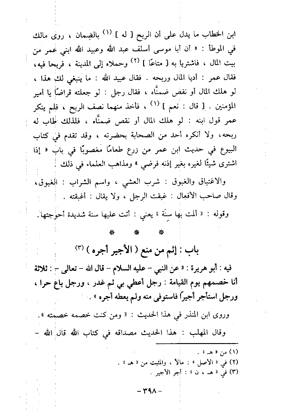 / 11 - فيه: أَبُو هُرَيْرَةَ، عَنِ النَّبِىِّ، عليه السَّلام، (قَالَ اللَّهُ تَعَالَى: ثَلاَثَةٌ أَنَا خَصْمُهُمْ يَوْمَ الْقِيَامَةِ: رَجُلٌ أَعْطَى بِى ثُمَّ غَدَرَ، وَرَجُلٌ بَاعَ حُرًّا فَأَكَلَ ثَمَنَهُ، وَرَجُلٌ اسْتَأْجَرَ أَجِيرًا فَاسْتَوْفَى مِنْهُ وَلَمْ يُعْطِهِ أَجْرَهُ) . وروى ابن المنذر فى هذا الحديث: (ومن كنت خصمه خصمته) . وقال المهلب: هذا الحديث مصداقه فى كتاب الله، قال الله -