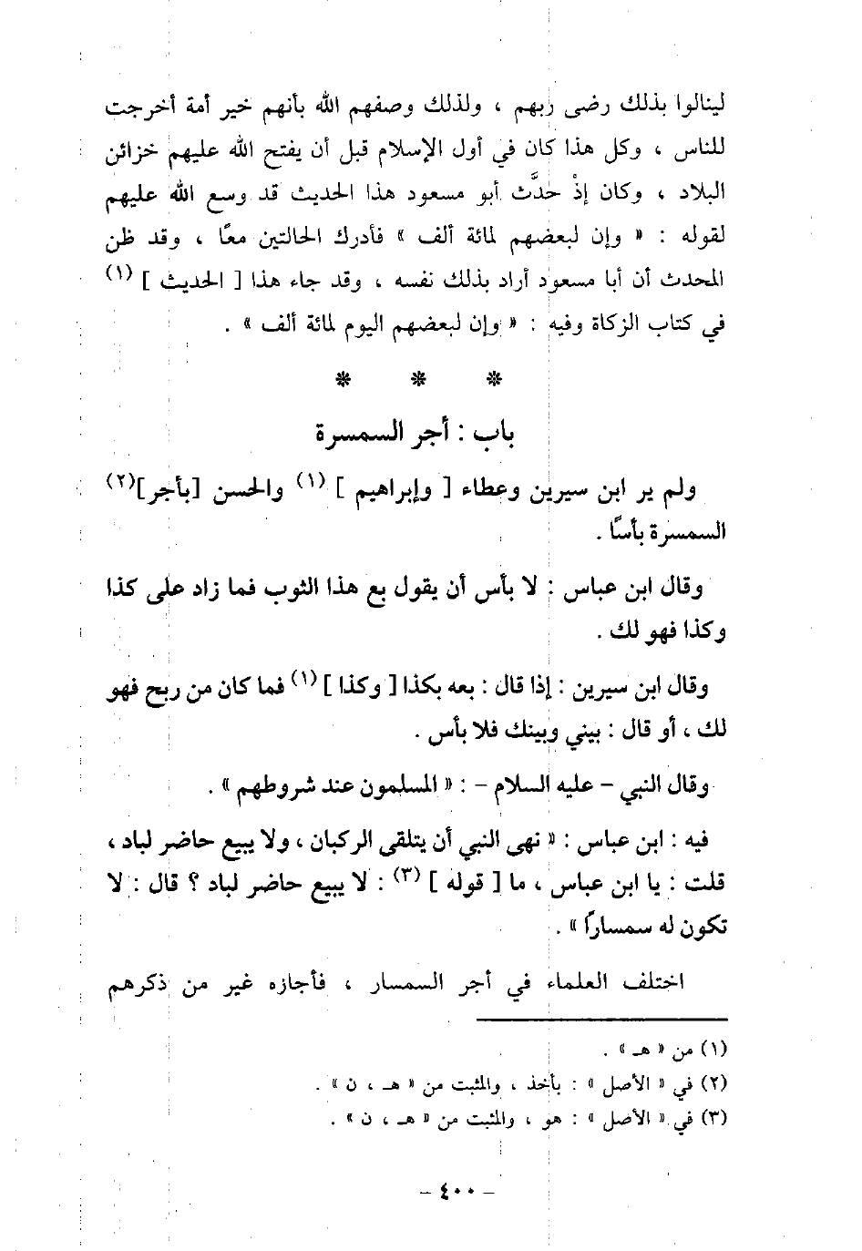 وَلَمْ يَرَ ابْنُ سِيرِينَ وَعَطَاءٌ وَإِبْرَاهِيمُ وَالْحَسَنُ بِأَجْرِ السِّمْسَارِ بَأْسًا. وَقَالَ ابْنُ عَبَّاسٍ: لاَ بَأْسَ أَنْ يَقُولَ: بِعْ هَذَا الثَّوْبَ، فَمَا زَادَ عَلَى كَذَا وَكَذَا فَهُوَ لَكَ. وَقَالَ ابْنُ سِيرِينَ: إِذَا قَالَ: بِعْهُ بِكَذَا، وَكَذا، فَمَا كَانَ مِنْ رِبْحٍ فَهُوَ لَكَ، أَوْ قَالَ: بَيْنِى وَبَيْنَكَ، فَلاَ بَأْسَ بِهِ. وَقَالَ النَّبىُّ عليه السَّلام: (الْمُسْلِمُونَ عِنْدَ شُرُوطِهِمْ) / 13 - فيه: ابْن عَبَّاس، نَهَى النَّبِىّ (صلى الله عليه وسلم) أَنْ يُتَلَقَّى الرُّكْبَانُ، وَلاَ يَبِيعَ حَاضِرٌ لِبَادٍ. قُلْتُ: يَا ابْنَ عَبَّاسٍ، مَا قَوْلُهُ: (لاَ يَبِيعُ حَاضِرٌ لِبَادٍ؟) ، قَالَ: لاَ يَكُونُ لَهُ سِمْسَارًا. اختلف العلماء فى أجر السمسار، فأجازه غير من ذكرهم