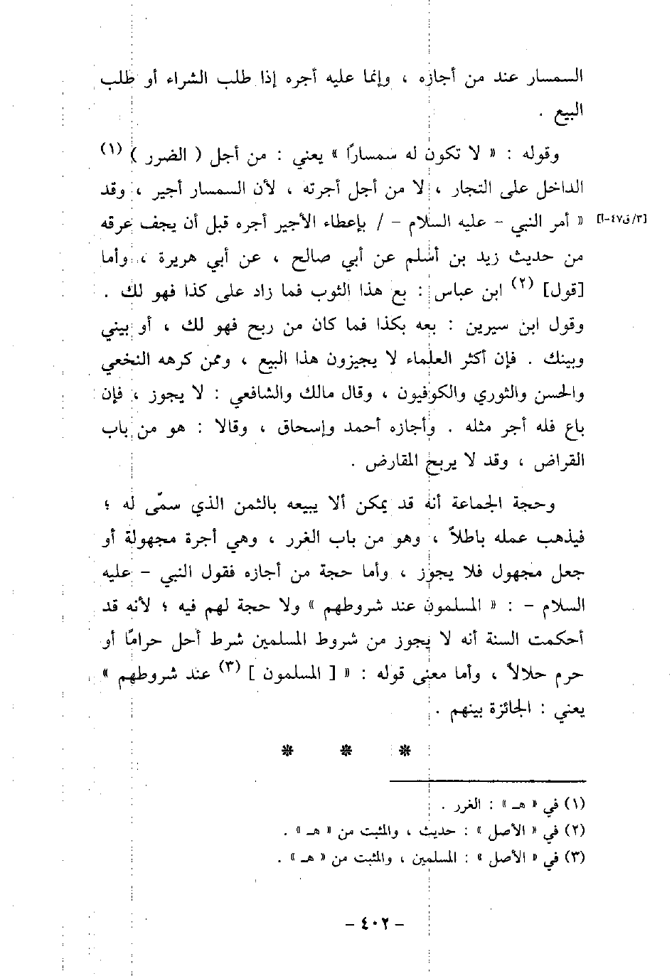 السمسار عند من أجازه، وإنما عليه أجره إذا طلب الشراء أو طلب البيع. وقوله: (لا تكون له سمسارًا) يعنى: من أجل الضرر الداخل على التجار، لا من أجل أجرته، لأن السمسار أجير، وقد (أمر النبى - عليه السلام - بإعطاء الأجير أجره قبل أن يجف عرقه) من حديث زيد بن أسلم عن أبى صالح، عن أبى هريرة. وأما قول ابن عباس: (بع هذا الثوب فما زاد على كذا فهو لك) . وقول ابن سيرين: (بعه بكذا فما كان من ربح فهو لك، أو بينى وبينك) . فإن أكثر العلماء لا يجيزون هذا البيع، وممن كرهه النخعى والحسن والثورى والكوفيون، وقال مالك والشافعى: لا يجوز، فإن باع فله أجر مثله. وأجازه أحمد وإسحاق، وقالا: هو من باب القراض، وقد لا يربح المقارض. وحجة الجماعة أنه قد يمكن ألا يبيعه بالثمن الذى سمى له؛ فيذهب عمله باطلاً، وهو من باب الغرر، وهى أجرة مجهولة أو جعل مجهول فلا يجوز، وأما حجة من أجازه فقول النبى - عليه السلام -: (المسلمون عند شروطهم) ولا حجة لهم فيه؛ لأنه قد أحكمت السنة أنه لا يجوز من شروط المسلمين شرط أحل حرامًا أو حرم حلالاً، وأما معنى قوله: (المسلمون عند شروطهم) يعنى: الجائزة بينهم.