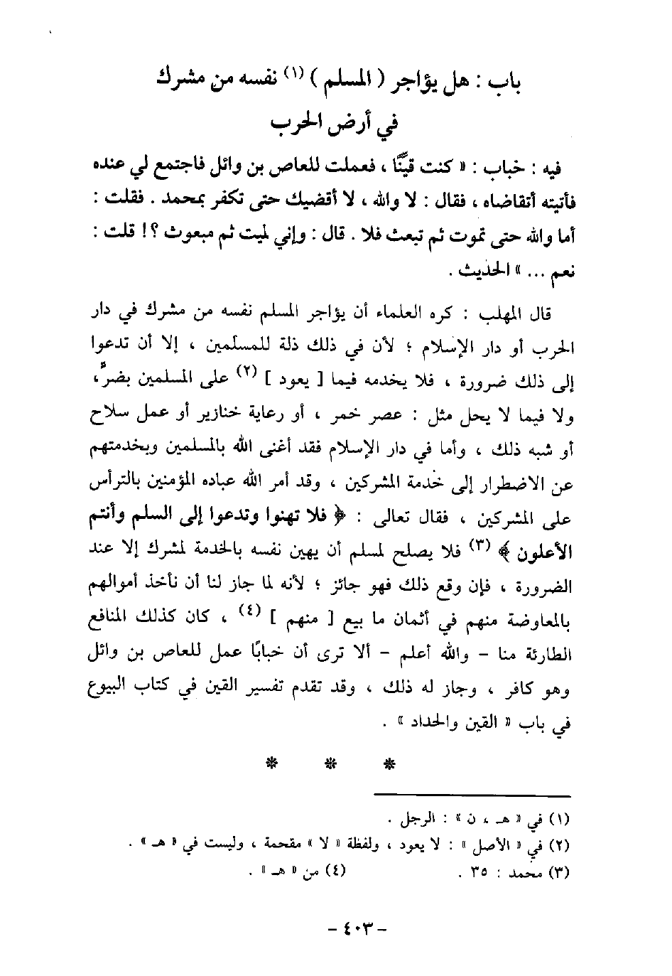 / 14 - فيه: خَبَّاب، قَالَ: كُنْتُ قَيْنًا، فَعَمِلْتُ لِلْعَاصِ بْنِ وَائِلٍ، فَاجْتَمَعَ لِى عِنْدَهُ، فَأَتَيْتُهُ أَتَقَاضَاهُ، فَقَالَ: لاَ وَاللَّهِ لاَ أَقْضِيكَ حَتَّى تَكْفُرَ بِمُحَمَّدٍ، فَقُلْتُ: أَمَا وَاللَّهِ حَتَّى تَمُوتَ ثُمَّ تُبْعَثَ فَلاَ، قَالَ: وَإِنِّى لَمَيِّتٌ ثُمَّ مَبْعُوثٌ؟ قُلْتُ: نَعَمْ. . . . الحديث. قال المهلب: كره العلماء أن يؤاجر المسلم نفسه من مشرك فى دار الحرب أو دار الإسلام؛ لأن فى ذلك ذلة للمسلمين، إلا أن تدعوا إلى ذلك ضرورة، فلا يخدمه فيما يعود على المسلمين بضر، ولا فيما لا يحل مثل: عصر خمر، أو رعاية خنازير أو عمل سلاح أو شبه ذلك، وأما فى دار الإسلام فقد أغنى الله بالمسلمين وبخدمتهم عن الاضطرار إلى خدمة المشركين، وقد أمر الله عبادة المؤمنين بالترأس على المشركين، فقال تعالى: (فلا تهنوا وتدعوا إلى السلم وأنتم الأعلون (فلا يصح لمسلم أن يهين نفسه بالخدمة لمشرك إلا عند الضرورة، فإن وقع ذلك فهو جائز؛ لأنه لما جاز لنا أن نأخذ أموالهم بالمعارضة منهم فى أثمان ما بيع منهم، كان كذلك المنافع الطارئة منا - والله أعلم - ألا ترى أن خبابًا عمل للعاص بن وائل وهو كافر، وجاز له ذلك، وقد تقدم تفسير القين فى كتاب البيوع فى باب: (القين) .