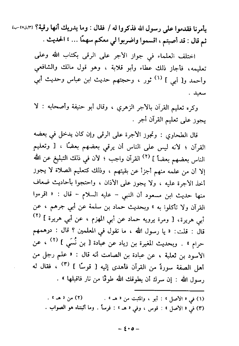 يَأْمُرُنَا، فَقَدِمُوا عَلَى رَسُولِ اللَّهِ (صلى الله عليه وسلم) ، فَذَكَرُوا لَهُ، فَقَالَ: (وَمَا يُدْرِيكَ أَنَّهَا رُقْيَةٌ) ، ثُمَّ قَالَ: (قَدْ أَصَبْتُمُ، اقْسِمُوا وَاضْرِبُوا لِى مَعَكُمْ سَهْمًا. . . .) ، الحديث. اختلف العلماء فى جواز الأجر على الرقى بكتاب الله وعلى تعليمه، فأجاز ذلك عطاء وأبو قلابة، وهو قول مالك والشافعى وأحمد وأبى ثور، وحجتهم حديث ابن عباس وحديث أبى سعيد. وكره تعليم القرآن بالأجر الزهرى، وقال أبو حنيفة وأصحابه: لا يجوز على تعليم القرآن أجر. قال الطحاوى: وتجوز الأجرة على الرقى وإن كان يدخل فى بعضه القرآن؛ لأنه ليس على الناس أن يرقى بعضهم بعضًا، وتعليم الناس بعضهم بعضًا القرآن واجب؛ لأن فى ذلك التبليغ عن الله إلا أن من علمه أجزأ عنه بقيتهم، وذلك كتعليم الصلاة لا يجوز أخذ الأجرة عليه، ولا يجوز على الأذان، واحتجوا بأحاديث ضعاف منها حديث ابن مسعود أن النبى - عليه السلام - قال: (اقرءوا القرآن ولا تأكلوا به) وبحديث حماد بن سلمة عن أبى جرهم، عن أبى هريرة، ومرة يرويه حماد عن أبى المهزم، عن أبى هريرة قال: قلت: (يا رسول الله، ما تقول فى المعلمين؟ قال: درهمهم حرام) . وبحديث المغيرة ابن زياد عن عبادة بن نسى، عن الأسود بن ثعلبة، عن عبادة بن الصامت أنه قال: (علم رجل من أهل الصفة سورة من القرآن فأهدى إليه قوسًا، فقال له رسول الله: إن سرك أن يطوقك الله طوقًا من نار فاقبلها) .