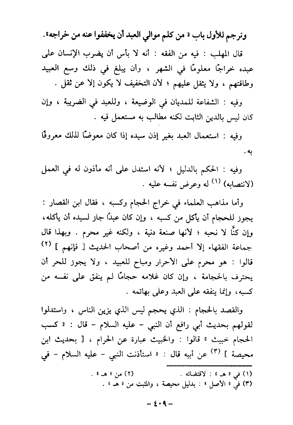وترجم للأول باب: (من كلم موالى العبد أن يخففوا عنه من خراجه) . قال المهلب: فيه من الفقه: أنه لا بأس أن يضرب الإنسان على عبده خراجًا معلومًا فى الشهر، وأن يبلغ فى ذلك وسع العبيد وطاقتهم، ولا يثقل عليهم؛ لأن التخفيف لا يكون إلا عن ثقل. وفيه: الشفاعة للمديان فى الوضيعة، وللعبد فى الضريبة، وإن كان ليس بالدين الثابت لكنه مطالب به مستعمل فيه. وفيه: استعمال العبد بغير إذن سيده إذا كان معوضًا لذلك معروفًا به. وفيه: الحكم بالدليل؛ لأنه استدل على أنه مأذون له فى العمل لانتصابه له وعرض نفسه عليه. وأما مذاهب العلماء فى خراج الحجام وكسبه، فقال ابن القصار: يجوز للحجام أن يأكل من كسبه، وإن كان عبدًا جاز لسيده أن يأكله، وإن كنا لا نحبه؛ لأنها صنعة دنية، ولكنه غير محرم. وبهذا قال جماعة الفقهاء إلا أحمد وغيره من أصحاب الحديث فإنهم قالوا: هو محرم على الأحرار ومباح للعبيد، ولا يجوز للحر أن يحترف بالحجامة، وإن كان غلامه حجامًا لم ينفق على نفسه من كسبه، وإنما ينفقه على العبد وعلى بهائمه. والقصد بالحجام: الذى يحجم ليس الذى يزين الناس، واستدلوا لقولهم بحديث أبى رافع أن النبى - عليه السلام - قال: (كسب الحجام خبيث) قالوا: والخبيث عبارة عن الحرام، بحديث ابن محيصة عن أبيه قال: (استأذنت النبى - عليه السلام - فى