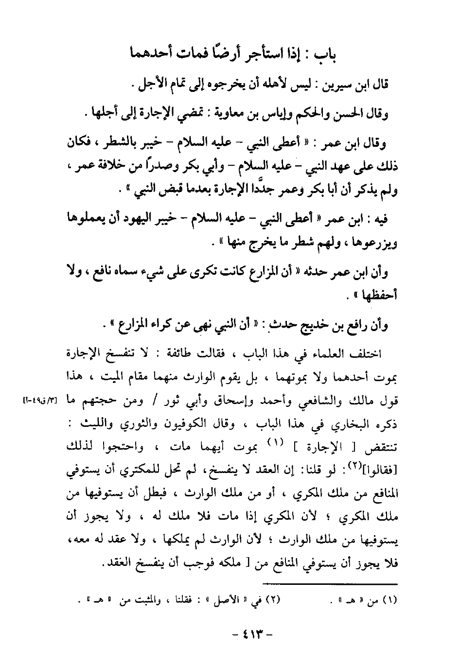 قَالَ ابْنُ سِيرِينَ: لَيْسَ لأَهْلِهِ أَنْ يُخْرِجُوهُ إِلَى تَمَامِ الأَجَلِ. وَقَالَ الْحَكَمُ وَالْحَسَنُ وَإِيَاسُ بْنُ مُعَاوِيَةَ: تُمْضَى الإِجَارَةُ إِلَى أَجَلِهَا. وَقَالَ ابْنُ عُمَرَ: أَعْطَى النَّبِىُّ، عليه السَّلام، خَيْبَرَ بِالشَّطْرِ، فَكَانَ ذَلِكَ عَلَى عَهْدِ النَّبِىِّ عليه السَّلام، وَأَبِى بَكْرٍ، وَصَدْرًا مِنْ خِلاَفَةِ عُمَرَ، وَلَمْ يُذْكَرْ أَنَّ أَبَا بَكْرٍ وَعُمَرَ جَدَّدَا الإِجَارَةَ بَعْدَمَا قُبِضَ النَّبِىُّ (صلى الله عليه وسلم) . / 20 - فيه: ابْن عُمَرَ، أَعْطَى النَّبِىّ، عليه السَّلام، خَيْبَرَ الْيَهُودَ أَنْ يَعْمَلُوهَا وَيَزْرَعُوهَا، وَلَهُمْ شَطْرُ مَا يَخْرُجُ مِنْهَا. وَأَنَّ ابْنَ عُمَرَ حَدَّثَهُ أَنَّ الْمَزَارِعَ كَانَتْ تُكْرَى عَلَى شَىْءٍ سَمَّاهُ نَافِعٌ، ولاَ أَحْفَظَهَا. وَأَنَّ رَافِعَ بْنَ خَدِيجٍ حَدَّثَ: أَنَّ النَّبِىَّ (صلى الله عليه وسلم) نَهَى عَنْ كِرَاءِ الْمَزَارِعِ. اختلف العلماء فى هذا الباب، فقالت طائفة: لا تنفسخ الإجارة بموت أحدهما ولا بموتهما، بل يقوم الوارث منهما مقام الميت، هذا قول مالك والشافعى وأحمد وإسحاق وأبى ثور ومن حجتهم ما ذكره البخارى فى هذا الباب، وقال الكوفيون والثورى والليث: تنتقض الإجارة بموت أيهما مات، واحتجوا لذلك فقالوا: لو قلنا: إن العقد لا ينفسخ، لم تحل للمكترى أن يستوفى المنافع من ملك المكرى، أو من ملك الوارث، فبطل أن يستوفيها من ملك المكرى؛ لأن المكرى إذا مات فلا ملك له، ولا يجوز أن يستوفيها من ملك الوارث؛ لأن الوارث لم يملكها، ولا عقد له معه، فلا يجوز أن يستوفى المنافع من ملكه فوجب أن ينفسخ العقد.