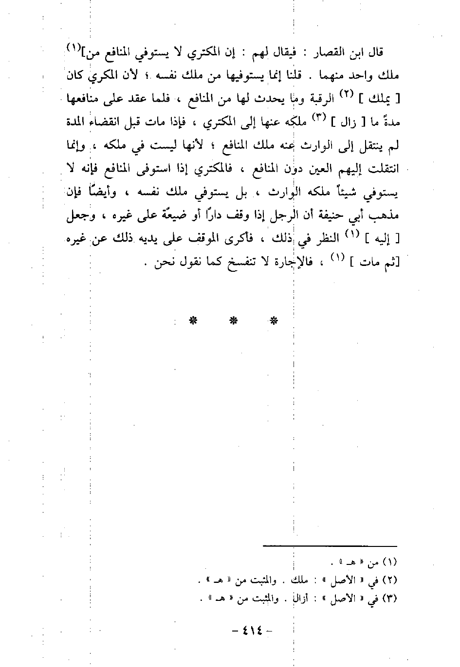 قال ابن القصار: فيقال لهم: إن المكترى لا يستوفى المنافع من ملك واحد منهما. قلنا إنما يستوفيها من ملك نفسه؛ لأن المكرى كان يملك الرقبة وما يحدث لها من المنافع، فلما عقد على منافعها مدة ما زال ملكه عنها إلى المكترى فإذا مات قبل انقضاء المدة لم ينتقل إلى الوارث عنه ملك المنافع؛ لأنها ليست فى ملكه، وإنها انتقلت إليهم العين دون المنافع، فالمكترى إذا استوفى المنافع فإنه لا يستوفى شيئًا ملكه الوارث، بل يستوفى ملك نفسه، وأيضًا فإن مذهب أبى حنيفة أن الرجل إذا وقف دارًا أو ضيعة على غيره، وجعل إليه النظر فى ذلك، فأكرى الموقف على يديه ذلك عن غيره ثم مات، فالإجارة لا تنفسخ كما نقول نحن.
