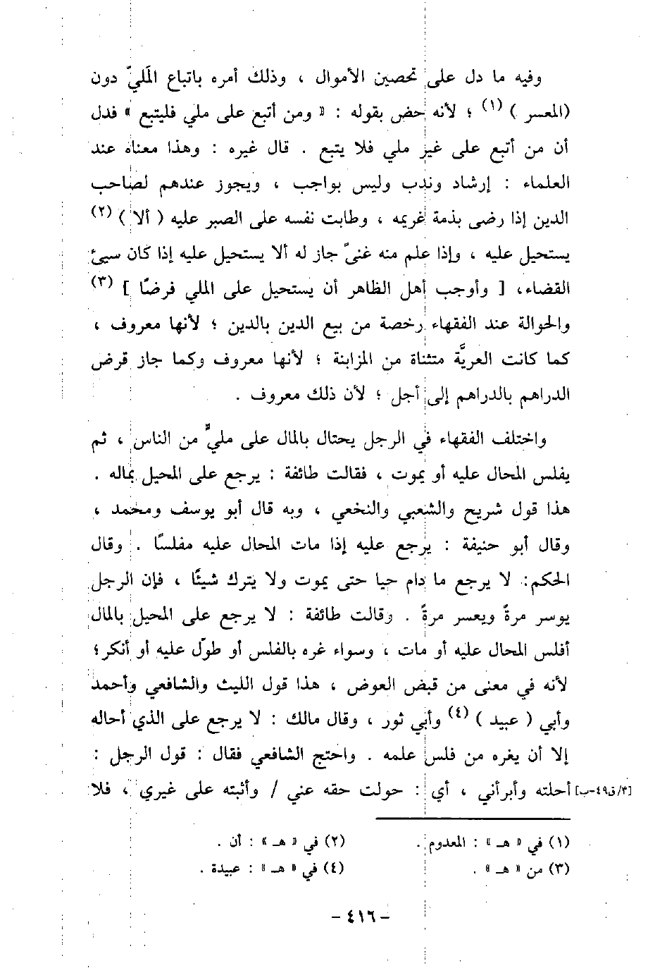 وفيه ما دل على تحصين الأموال، وذلك أمره باتباع الملى دون المعسر؛ لأنه حض بقوله: (ومن أتبع على ملى فليتبع) فدل أن من أتبع على غير ملى فلا يتبع. قال غيره: وهذا معناه عند العلماء: إرشاد وندب وليس بواجب، ويجوز عندهم لصاحب الدين إذا رضى بذمة غريمه، وطابت نفسه على الصبر عليه ألا يستحيل عليه، وإذا علم غنى جاز له ألا يستحلى عليه إذا كان سيئ القضاء، وأوجب أهل الظاهر أن يستحيل على الملى فرضًا. والحوالة عند الفقهاء رخصة من بيع الدين بالدين؛ لأنها معروف، كما كانت العرية متثناة من المزابنة؛ لأنها معروف وكما جاز قرض الدراهم بالدراهم إلى أجل؛ لأن ذلك معروف. واختلف الفقهاء فى الرجل يحتال المال على ملى من الناس، ثم يفلس المحال عليه أو يموت، فقالت طائفة: يرجع على المحيل بماله. هذا قول شريح والشعبى والنخعى، وبه قال أبو يوسف ومحمد، وقال أبو حنيفة: يرجع عليه إذا مات المحال عليه مفلسًا. وقال الحكم: لا يرجع مادام حيا حتى يموت ولا يترك شيئًا، فإن الرجل يوسر مرة ويعسر مرةً. وقالت طائفة: لا يرجع على المحيل بالمال أفلس المحال عليه أو مات، وسواء غره بالفلس أو طول عليه أو أنكره؛ لأنه فى معنى من قبض العوض، هذا قول الليث والشافعى وأحمد وأبى عبيد وأبى ثور، وقال مالك: لا يرجع على الذى أحاله إلا أن يغره من فلس علمه. واحتج الشافعى فقال: قول الرجل: أحلته وأبرأنى، أى: حولت حقه عنى وأثبته على غيرى، فلا