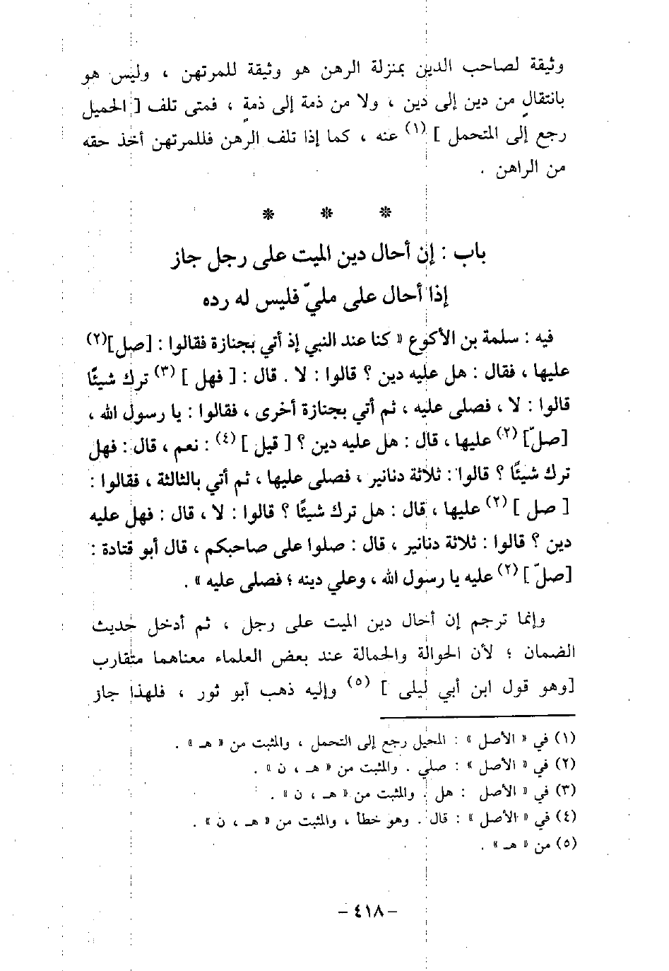 / 2 - فيه: سَلَمَةَ بْنِ الأَكْوَعِ، كُنَّا جُلُوسًا عِنْدَ النَّبِىِّ (صلى الله عليه وسلم) ، إِذْ أُتِىَ بِجَنَازَةٍ، فَقَالُوا: صَلِّ عَلَيْهَا، فَقَالَ: (هَلْ عَلَيْهِ دَيْنٌ؟) ، قَالُوا: لاَ، قَالَ: (فَهَلْ تَرَكَ شَيْئًا؟) ، قَالُوا: لاَ، فَصَلَّى عَلَيْهِ، ثُمَّ أُتِىَ بِجَنَازَةٍ أُخْرَى، فَقَالُوا: يَا رَسُولَ اللَّهِ، صَلِّ عَلَيْهَا، قَالَ: (هَلْ عَلَيْهِ دَيْنٌ؟) ، قِيلَ: نَعَمْ، قَالَ: (فَهَلْ تَرَكَ شَيْئًا؟) ، قَالُوا: ثَلاَثَةَ دَنَانِيرَ، فَصَلَّى عَلَيْهَا، ثُمَّ أُتِىَ بِالثَّالِثَةِ، فَقَالُوا: صَلِّ عَلَيْهَا، قَالَ: (هَلْ تَرَكَ شَيْئًا؟) ، قَالُوا: لاَ، قَالَ: (فَهَلْ عَلَيْهِ دَيْنٌ؟) ، قَالُوا: ثَلاَثَةُ دَنَانِيرَ، قَالَ: (صَلُّوا عَلَى صَاحِبِكُمْ) ، قَالَ أَبُو قَتَادَةَ: صَلِّ عَلَيْهِ يَا رَسُولَ اللَّهِ وَعَلَىَّ دَيْنُهُ، فَصَلَّى عَلَيْهِ. وإنما ترجم إن أحال دين الميت على رجل، ثم أدخل حديث الضمان، لأن الحوالة والحمالة عند بعض العلماء معناهما متقارب وهو قول ابن أبى ليلى وإليه ذهب أبو ثور، فلهذا جاز