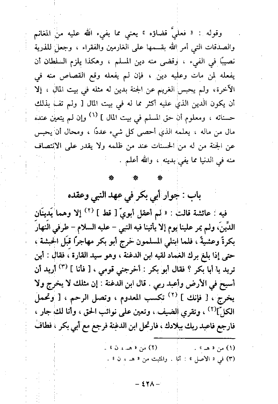 / 10 - فيه: عَائِشَةَ، قَالَتْ: لَمْ أَعْقِلْ أَبَوَىَّ قَطُّ إِلاَ وَهُمَا يَدِينَانِ الدِّينَ، وَلَمْ يَمُرَّ عَلَيْنَا يَوْمٌ إِلاَ يَأْتِينَا فِيهِ النَّبِىّ، عليه السَّلام طَرَفَىِ النَّهَارِ بُكْرَةً وَعَشِيَّةً، فَلَمَّا ابْتُلِىَ الْمُسْلِمُونَ، خَرَجَ أَبُو بَكْرٍ مُهَاجِرًا قِبَلَ الْحَبَشَةِ، حَتَّى إِذَا بَلَغَ بَرْكَ الْغِمَادِ لَقِيَهُ ابْنُ الدَّغِنَةِ، وَهُوَ سَيِّدُ الْقَارَةِ، فَقَالَ: أَيْنَ تُرِيدُ يَا أَبَا بَكْرٍ؟ فَقَالَ أَبُو بَكْرٍ: أَخْرَجَنِى قَوْمِى، فَأَنَا أُرِيدُ أَنْ أَسِيحَ فِى الأَرْضِ فَأَعْبُدَ رَبِّى، قَالَ ابْنُ الدَّغِنَةِ: إِنَّ مِثْلَكَ لاَ يَخْرُجُ وَلاَ يُخْرَجُ، فَإِنَّكَ تَكْسِبُ الْمَعْدُومَ، وَتَصِلُ الرَّحِمَ، وَتَحْمِلُ الْكَلَّ، وَتَقْرِى الضَّيْفَ، وَتُعِينُ عَلَى نَوَائِبِ الْحَقِّ، وَأَنَا لَكَ جَارٌ، فَارْجِعْ فَاعْبُدْ رَبَّكَ بِبِلاَدِكَ، فَارْتَحَلَ ابْنُ الدَّغِنَةِ، فَرَجَعَ مَعَ أَبِى بَكْرٍ، فَطَافَ