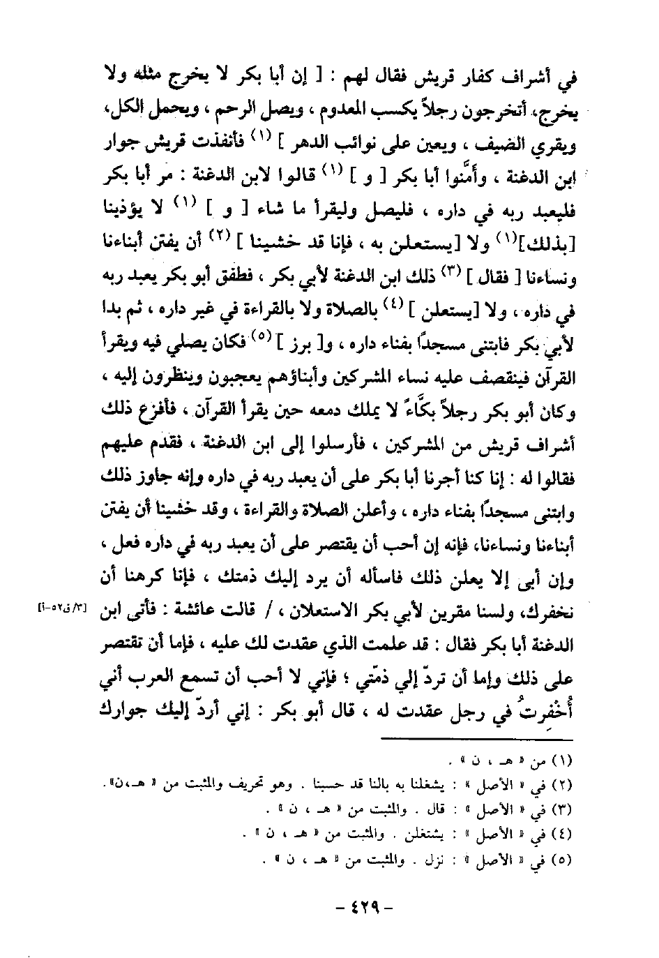 فِى أَشْرَافِ كُفَّارِ قُرَيْشٍ، فَقَالَ لَهُمْ: إِنَّ أَبَا بَكْرٍ لاَ يَخْرُجُ مِثْلُهُ وَلاَ يُخْرَجُ، أَتُخْرِجُونَ رَجُلاً يُكْسِبُ الْمَعْدُومَ، وَيَصِلُ الرَّحِمَ، وَيَحْمِلُ الْكَلَّ، وَيَقْرِى الضَّيْفَ، وَيُعِينُ عَلَى نَوَائِبِ الْدَهرِّ، فَأَنْفَذَتْ قُرَيْشٌ جِوَارَ ابْنِ الدَّغِنَةِ، وَآمَنُوا أَبَا بَكْرٍ، وَقَالُوا لابْنِ الدَّغِنَةِ: مُرْ أَبَا بَكْرٍ فَلْيَعْبُدْ رَبَّهُ فِى دَارِهِ، فَلْيُصَلِّ وَلْيَقْرَأْ مَا شَاءَ وَلاَ يُؤْذِينَا بِذَلِكَ وَلاَ يَسْتَعْلِنْ بِهِ، فَإِنَّا قَدْ خَشِينَا أَنْ يَفْتِنَ أَبْنَاءَنَا وَنِسَاءَنَا، قَالَ ذَلِكَ ابْنُ الدَّغِنَةِ لأَبِى بَكْرٍ، فَطَفِقَ أَبُو بَكْرٍ يَعْبُدُ رَبَّهُ فِى دَارِهِ وَلاَ يَسْتَعْلِنُ بِالصَّلاَةِ وَلاَ الْقِرَاءَةِ فِى غَيْرِ دَارِهِ، ثُمَّ بَدَا لأَبِى بَكْرٍ، فَابْتَنَى مَسْجِدًا بِفِنَاءِ دَارِهِ وَبَرَزَ، فَكَانَ يُصَلِّى فِيهِ وَيَقْرَأُ الْقُرْآنَ، فَيَتَقَصَّفُ عَلَيْهِ نِسَاءُ الْمُشْرِكِينَ وَأَبْنَاؤُهُمْ يَعْجَبُونَ وَيَنْظُرُونَ إِلَيْهِ، وَكَانَ أَبُو بَكْرٍ رَجُلاً بَكَّاءً لاَ يَمْلِكُ دَمْعَهُ حِينَ يَقْرَأُ الْقُرْآنَ، فَأَفْزَعَ ذَلِكَ أَشْرَافَ قُرَيْشٍ مِنَ الْمُشْرِكِينَ، فَأَرْسَلُوا إِلَى ابْنِ الدَّغِنَةِ فَقَدِمَ عَلَيْهِمْ، فَقَالُوا لَهُ: إِنَّا كُنَّا أَجَرْنَا أَبَا بَكْرٍ عَلَى أَنْ يَعْبُدَ رَبَّهُ فِى دَارِهِ، وَإِنَّهُ جَاوَزَ ذَلِكَ فَابْتَنَى مَسْجِدًا بِفِنَاءِ دَارِهِ وَأَعْلَنَ الصَّلاَةَ وَالْقِرَاءَةَ، وَقَدْ خَشِينَا أَنْ يَفْتِنَ أَبْنَاءَنَا وَنِسَاءَنَا فَأْتِهِ، فَإِنْ أَحَبَّ أَنْ يَقْتَصِرَ عَلَى أَنْ يَعْبُدَ رَبَّهُ فِى دَارِهِ فَعَلَ، وَإِنْ أَبَى إِلاَ أَنْ يُعْلِنَ ذَلِكَ، فَسَلْهُ أَنْ يَرُدَّ إِلَيْكَ ذِمَّتَكَ، فَإِنَّا كَرِهْنَا أَنْ نُخْفِرَكَ وَلَسْنَا مُقِرِّينَ لأَبِى بَكْرٍ الاسْتِعْلاَنَ. قَالَتْ عَائِشَةُ: فَأَتَى ابْنُ الدَّغِنَةِ أَبَا بَكْرٍ، فَقَالَ: قَدْ عَلِمْتَ الَّذِى عَقَدْتُ لَكَ عَلَيْهِ، فَإِمَّا أَنْ تَقْتَصِرَ عَلَى ذَلِكَ، وَإِمَّا أَنْ تَرُدَّ إِلَىَّ ذِمَّتِى، فَإِنِّى لاَ أُحِبُّ أَنْ تَسْمَعَ الْعَرَبُ أَنِّى أُخْفِرْتُ فِى رَجُلٍ عَقَدْتُ لَهُ، قَالَ أَبُو بَكْرٍ: إِنِّى أَرُدُّ إِلَيْكَ جِوَارَكَ