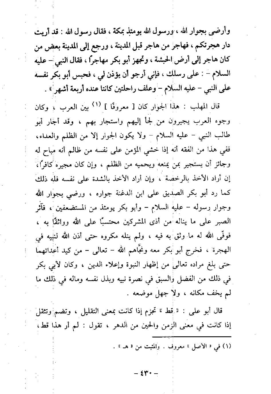 وَأَرْضَى بِجِوَارِ اللَّهِ وَرَسُولُ اللَّهِ (صلى الله عليه وسلم) يَوْمَئِذٍ بِمَكَّةَ، فَقَالَ رَسُولُ اللَّهِ (صلى الله عليه وسلم) : (قَدْ أُرِيتُ دَارَ هِجْرَتِكُمْ، [رَأَيْتُ سَبْخَةً ذَاتَ نَخْلٍ بَيْنَ لاَبَتَيْنِ) ، وَهُمَا الْحَرَّتَانِ] ، فَهَاجَرَ مَنْ هَاجَرَ قِبَلَ الْمَدِينَةِ، وَرَجَعَ إِلَى الْمَدِينَةِ بَعْضُ مَنْ كَانَ هَاجَرَ إِلَى أَرْضِ الْحَبَشَةِ، وَتَجَهَّزَ أَبُو بَكْرٍ مُهَاجِرًا، فَقَالَ النَّبِىّ، عليه السَّلام: (عَلَى رِسْلِكَ، فَإِنِّى أَرْجُو أَنْ يُؤْذَنَ لِى) ، فَحَبَسَ أَبُو بَكْرٍ نَفْسَهُ عَلَى النَّبىِّ عَلَيْهِ السَّلاَم؛ لِيَصْحَبَهُ، وَعَلَفَ رَاحِلَتَيْنِ كَانَتَا عِنْدَهُ أَرْبَعَةَ أَشْهُرٍ. قال المهلب: هذا الجوار كان معروفًا بين العرب، وكان وجوه العرب يجيرون من لجأ إليهم واستجار بهم، وقد أجار أبو طالب النبى - عليه السلام - ولا يكون الجوار إلا من الظلم والعداء، ففى هذا من الفقه أنه إذا خشى المؤمن على نفسه من ظالم أنه مباح له وجائز أن يستجير بمن يمنعه ويحميه من الظلم، وإن كان مجيره كافرًا، إن أراد الأخذ بالرخصة، وإن أراد الأخذ بالشدة على نفسه فله ذلك كما رد أبو بكر الصديق على ابن الدغنة جواره، ورضى بجوار الله وجوار رسوله - عليه السلام - وأبو بكر يومئذ من المستضعفين، فآثر الصبر على ما يناله من أذى المشركين محتسبا على الله وواثقا به، فوفى الله له ما وثق به فيه، ولم ينله مكروه حتى أذن الله لنبيه فى الهجرة، فخرج أبو بكر معه ونجاهم الله - تعالى - من كيد أعدائهما حتى بلغ مراده تعالى من إظهار النبوة وإعلاء الدين، وكان لأبى بكر فى ذلك من الفضل والسبق فى نصرة نبيه وبذل نفسه وماله فى ذلك ما لم يخف مكانه، ولا جهل موضعه. قال أبو على: (قط) تجزم إذا كانت بمعنى التقليل، وتضم وتثقل إذا كانت فى معنى الزمن والحين من الدهر، تقول: لم أر هذا قط،