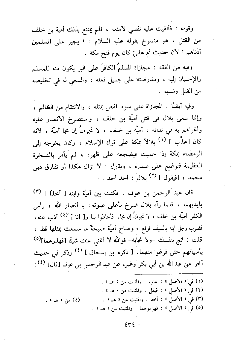 وقوله: فألقيت عليه نفسى لأمنعه، فلم يمتنع بذلك أمية بن خلف من القتل، هو منسوخ بقوله عليه السلام: (يجير على المسلمين أدناهم) لأن حديث أم هانئ كان يوم فتح مكة. وفيه من الفقه: مجازاة المسلمُ الكافَر على البر يكون منه للمسلم والإحسان إليه، ومفارضته على جميل فعله، والسعى له فى تخليصه من القتل وشبهه. وفيه أيضًا: المجازاة على سوء الفعل بمثله، والانتقام من الظالم، وإنما سعى بلال فى قتل أمية بن خلف، واستصرخ الأنصار عليه وأغراهم به فى ندائه: أمية بن خلف، لا نجوتُ إن نجا أمية؛ لأنه كان عذب بلالاً بمكة على ترك الإسلام، وكان يخرجه إلى الرمضاء بمكة إذا حميت فيضجعه على ظهره، ثم يأمر بالصخرة العظيمة فتوضع على صدره، ويقول: لا تزال هكذا أو تفارق دين محمد، فيقول بلال: أحد أحد. قال عبد الرحمن بن عوف: فكنت بين أمية وابنه آخذًا بأيديهما، فلما رآه بلال صرخ بأعلى صوته: يا أنصار الله، رأس الكفر أمية بن خلف، لا نجوتُ إن نجا، فأحاطوا بنا وأنا أذب عنه، فضرب رجل ابنه بالسيف فوقع، وصاح أمية صيحة ما سمعت بمثلها قط، قلت: انج بنفسك - ولا نجاية - فو الله لا أغنى عنك شيئًا فهذوهما بأسيافهم حتى فرغوا منهما. ذكره ابن إسحاق وذكر فى حديث آخر عن عبد الله بن أبى بكر وغيره عن عبد الرحمن بن عوف قال: