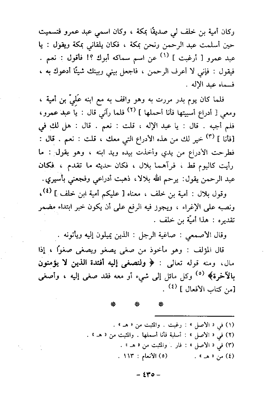 وكان أمية بن خلف لى صديقًا بمكة، وكان اسمى عبد عمرو فتسميت حين أسلمت عبد الرحمن ونحن بمكة، فكان يلقانى بمكة ويقول: يا عبد عمرو أرغبت عن اسم سماكه أبوك؟ فأقول: نعم. فيقول: فإنى لا أعرف الرحمن، فاجعل بينى وبينك شيئًا أدعوك به، فسماه عبد الإله. فلما كان يوم بدر مررت به وهو واقف به مع ابنه على بن أمية، ومعى أدراع أسبيتها فأنا أحملها فلما رآنى قال: يا عبد عمرو، فلم أجبه. قال: يا عبد الإله، قلت: نعم. قال: هل لك فى فأنا خير لك من هذه الأدراع التى معك، قلت: نعم. قال: فطرحت الأدراع من يدى وأخذت بيده ويد ابنه، وهو يقول: ما رأيت كاليوم قط، فرآهما بلال، فكان حديثه ما تقدم، فكان عبد الرحمن يقول: يرحم الله بلالا، ذهبت أدراعى وفجعنى بأسيرى. وقول بلال: أمية بن خلف، معناه عليكم أمية ابن خلف، ونصبه على الإغراء، ويجوز فيه الرفع على أن يكون خبر ابتداء مضمر تقديره: هذا أمية بن خلف. وقال الأصمعى: صاغية الرجل: الذين يميلون إليه ويأتونه. قال المؤلف: وهو مأخوذ من صغى يصغو ويصغى صغوًا، إذا مال، ومنه قوله تعالى: (ولتصغى إليه أفئدة الذين لا يؤمنون بالآخرة (وكل مائل إلى شىء أو معه فقد صغى إليه، وأصغى من كتاب الأفعال.