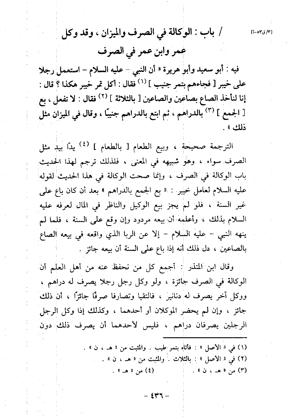 . / 4 - فيه: أَبُو سَعِيد، وَأَبُو هُرَيْرَةَ، أَنَّ النَّبِىّ، عليه السَّلام، اسْتَعْمَلَ رَجُلاً عَلَى خَيْبَرَ، فَجَاءَهُمْ بِتَمْرٍ جَنِيبٍ، فَقَالَ: (أَكُلُّ تَمْرِ خَيْبَرَ هَكَذَا) ؟ قَالَ: إِنَّا لَنَأْخُذُ الصَّاعَ بِالصَّاعَيْنِ، وَالصَّاعَيْنِ بِالثَّلاَثَةِ، فَقَالَ: (لاَ تَفْعَلْ، بِعِ الْجَمْعَ بِالدَّرَاهِمِ، ثُمَّ ابْتَعْ بِالدَّرَاهِمِ جَنِيبًا) ، وَقَالَ فِى الْمِيزَانِ مِثْلَ ذَلِكَ. الترجمة صحيحة، وبيع الطعام بالطعام يدًا بيد مثل الصرف سواء، وهو شبيهه فى المعنى، فلذلك ترجم لهذا الحديث باب الوكالة فى الصرف، وإنما صحت الوكالة فى هذا الحديث لقوله عليه السلام لعامل خيبر: (بع الجمع بالدراهم) بعد أن كان باع على غير السنة، فلو لم يجز بيع الوكيل والناظر فى المال لعرفه عليه السلام بذلك، وأعلمه أن بيعه مردود وإن وقع على السنة، فلما لم ينه النبى - عليه السلام - إلا عن الربا الذى واقعه فى بيعه الصاع بالصاعين، دل ذلك أنه إذا باع على السنة أن بيعه جائز. وقال ابن المنذر: أجمع كل من نحفظ عنه من أهل العلم أن الوكالة فى الصرف جائزة، ولو وكل رجل رجلا يصرف له دراهم، ووكل آخر يصرف له دنانير، فالتقيا وتصارفا صرفًا جائزًا، أن ذلك جائز، وإن لم يحضر الموكلان أو أحدهما، وكذلك إذا وكل الرجل الرجلين يصرفان دراهم، فليس لأحدهما أن يصرف ذلك دون