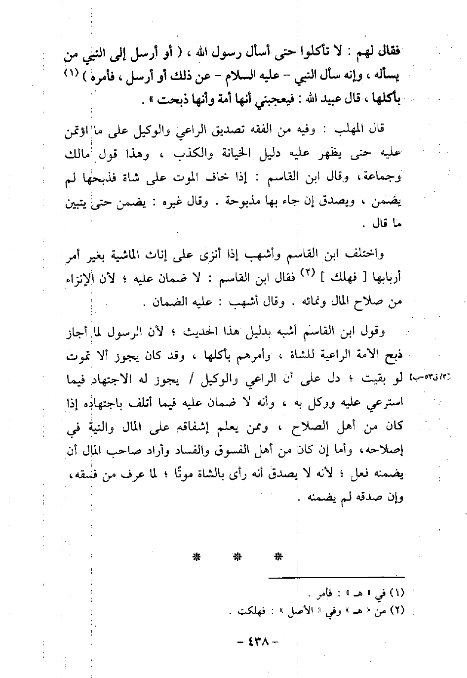 فَقَالَ لَهُمْ: لاَ تَأْكُلُوا حَتَّى أَسْأَلَ رَسُول اللَّه (صلى الله عليه وسلم) ، أَوْ أُرْسِلَ مَنْ يَسْأَلُهُ، وَأَنَّهُ سَأَلَ النَّبِىَّ، عليه السلام، عَنْ ذَاكَ، أَوْ أَرْسَلَ، فَأَمَرَهُ بِأَكْلِهَا. قَالَ عُبَيْدُاللَّهِ: فَيُعْجِبُنِى أَنَّهَا أَمَةٌ، وَأَنَّهَا ذَبَحَتْ. قال المهلب: وفيه من الفقه تصديق الراعى والوكيل على ما أؤتمن عليه حتى يظهر عليه دليل الخيانة والكذب، وهذا قول مالك وجماعة، وقال ابن القاسم: إذا خاف الموت على شاة فذبحها لم يضمن، ويصدق إن جاء بها مذبوحة. وقال غيره: يضمن حتى يتبين ما قال. واختلف ابن القاسم وأشهب إذا أنزى على إناث بغير أمر أربابها فهلك فقال ابن القاسم: لا ضمان عليه؛ لأن الإنزاء من صلاح المال ونمائه. وقال أشهب: عليه الضمان. وقول ابن القاسم أشبه بدليل هذا الحديث؛ لأن الرسول لما أجاز ذبح الأمة الراعية للشاة، وأمرهم بأكلها، وقد كان يجوز ألا تموت لو بقيت؛ دل على أن الراعى والوكيل يجوز له الاجتهاد فيما استرعى عليه ووكل به، وأنه لا ضمان عليه فيما أتلف باجتهاده إذا كان من أهل الصلاح، وممن يعلم إشفاقه على المال والنية فى إصلاحه، وأما إن كان من أهل الفسوق والفساد وأراد صاحب المال أن يضمنه فعل؛ لأنه لا يصدق أنه رأى بالشاة موتا؛ لما عرف من فسقه، وإن صدقه لم يضمنه.