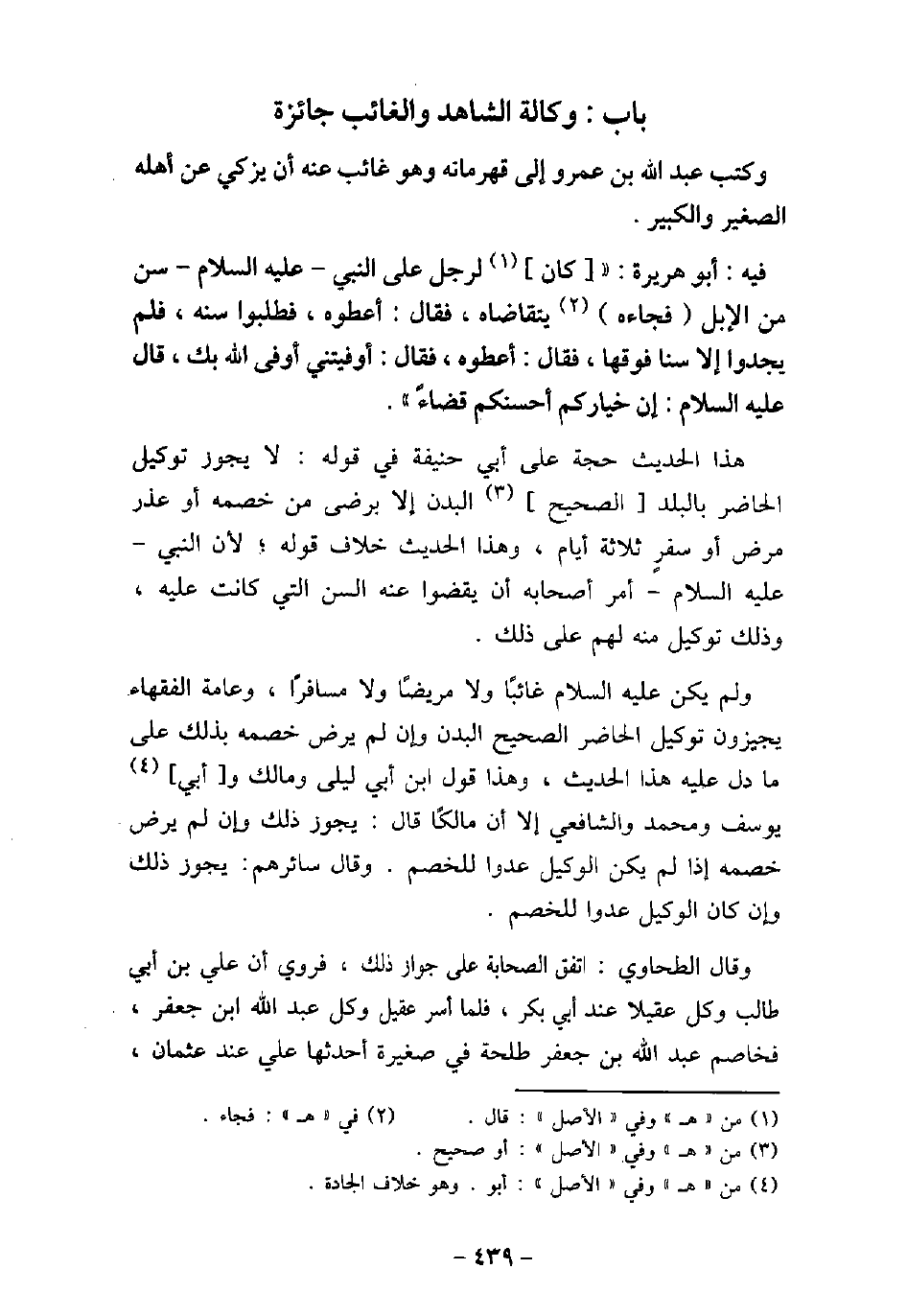 وَكَتَبَ عَبْدُاللَّهِ بْنُ عَمْرٍو إِلَى قَهْرَمَانِهِ وَهُوَ غَائِبٌ عَنْهُ، أَنْ يُزَكِّىَ عَنْ أَهْلِهِ الصَّغِيرِ وَالْكَبِيرِ. / 6 - فيه: أَبُو هُرَيْرَةَ، كَانَ لِرَجُلٍ عَلَى النَّبِىِّ، عليه السلام، سِنٌّ مِنَ الإِبِلِ، فَجَاءَهُ يَتَقَاضَاهُ، فَقَالَ: (أَعْطُوهُ) ، فَطَلَبُوا سِنَّهُ، فَلَمْ يَجِدُوا لَهُ إِلاَ سِنًّا فَوْقَهَا، فَقَالَ: (أَعْطُوهُ) ، فَقَالَ: أَوْفَيْتَنِى أَوْفَى اللَّهُ بِكَ، قَالَ عليه السلام: (إِنَّ خِيَارَكُمْ أَحْسَنُكُمْ قَضَاءً) . هذا الحديث حجة على أبى حنيفة فى قوله: لا يجوز توكيل الحاضر بالبلد الصحيح البدن إلا برضى من خصمه أو عذر مرض أو سفر ثلاثة أيام، وهذا الحديث خلاف قوله؛ لأن النبى - عليه السلام - أمر أصحابه أن يقضوا عنه السن التى كانت عليه وذلك توكيل منه لهم على ذلك. ولم يكن عليه السلام غائبًا ولا مريضًا ولا مسافرًا، وعامة الفقهاء يجيزون توكيل الحاضر الصحيح البدن وإن لم يرض خصمه بذلك على ما دل عليه هذا الحديث، وهذا قول ابن أبى ليلى ومالك وأبى يوسف ومحمد والشافعى إلا أن مالكًا قال: يجوز ذلك وإن لم يرض خصمه إذا لم يكن الوكيل عدوا للخصم. وقال سائرهم: يجوز ذلك وإن كان الوكيل عدو للخصم. وقال الطحاوى: اتفق الصحابة على جواز ذلك، فروى أن على بن أبى طالب وكل عقيلا عند أبى بكر، فلما أسر عقيل وكل عبد الله ابن جعفر، فخاصم عبد الله بن جعفر طلحة فى صغيرة أحدثها على عند عثمان،
