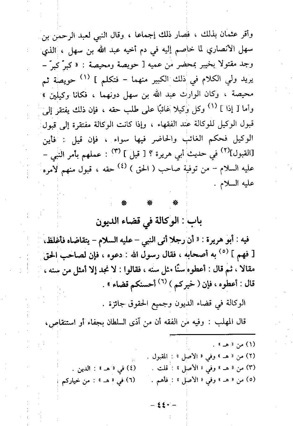 / 7 - فيه: أَبُو هُرَيْرَةَ، أَنَّ رَجُلاً أَتَى النَّبِىَّ، عليه السلام، يَتَقَاضَاهُ فَأَغْلَظَ، فَهَمَّ بِهِ أَصْحَابُهُ، فَقَالَ رَسُولُ اللَّهِ (صلى الله عليه وسلم) : (دَعُوهُ، فَإِنَّ لِصَاحِبِ الْحَقِّ مَقَالاً) ، ثُمَّ قَالَ: (أَعْطُوهُ سِنًّا مِثْلَ سِنِّهِ) ، فَقَالُوا: لاَنجد إِلاَ أَمْثَلَ مِنْ سِنِّهِ، فَقَالَ: (أَعْطُوهُ، فَإِنَّ مِنْ خَيْرِكُمْ أَحْسَنَكُمْ قَضَاءً) . الوكالة فى قضاء الديون وجميع الحقوق جائزة. قال المهلب: وفيه من الفقه أن من آذى السلطان بجفاء أو استنقاص،