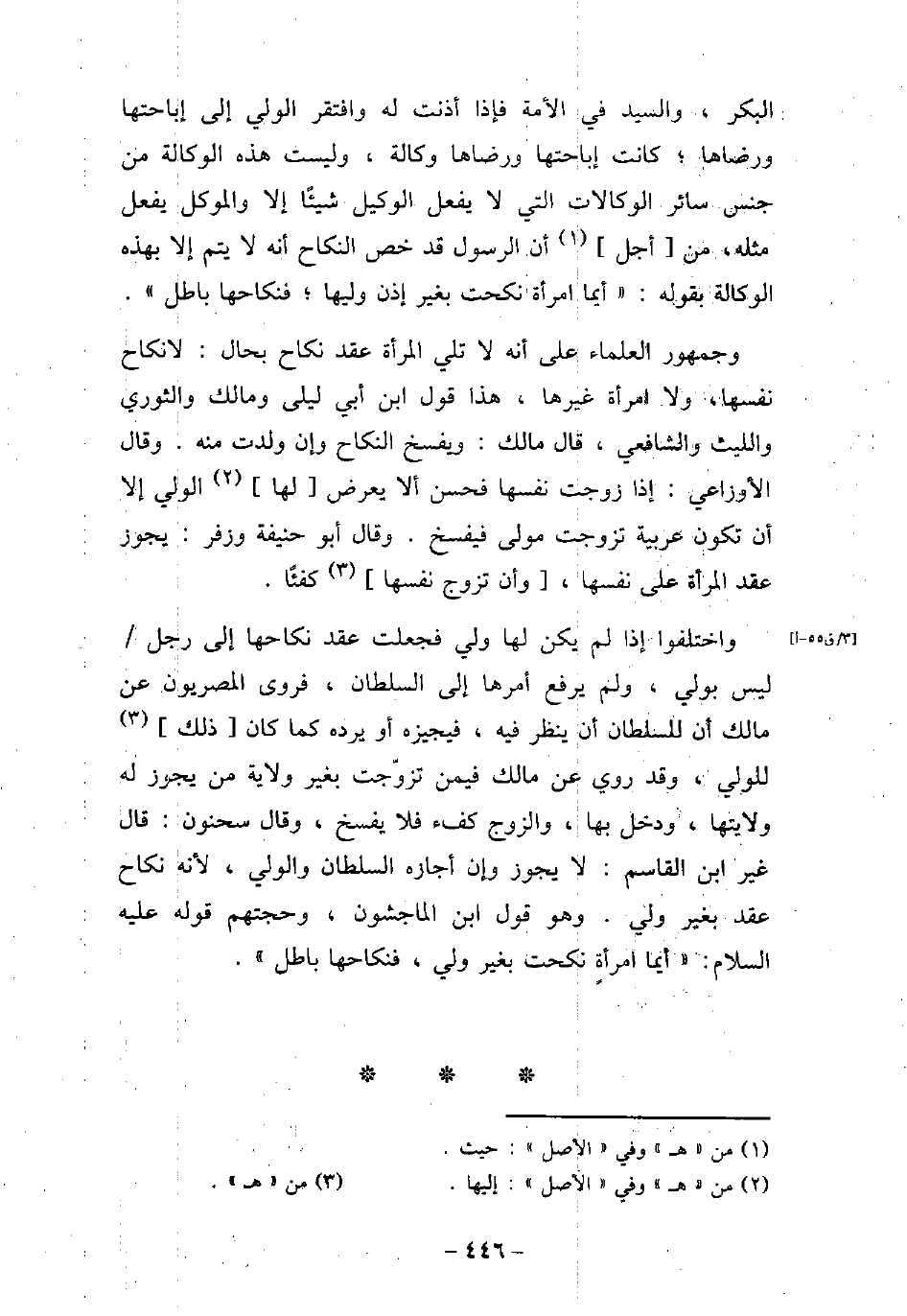 البكر، والسيد فى الأمة فإذا أذنت له وافتقر الولى إلى إباحتها ورضاها، كانت إباحتها ورضاها وكالة، وليست هذه الوكالة من جنس سائر الوكالات التى لا يفعل الوكيل شيئًا إلا والموكل يفعل مثله، من أجل أن الرسول قد خص النكاح أنه لا يتم إلا بهذه الوكالة بقوله: (أيما امرأة نكحت بغير إذن وليها، فنكاحها باطل) . وجمهور العلماء على أنه لا تلى المرأة عقد نكاح بحال: لا نكاح نفسها، ولا امرأة غيرها، هذا قول ابن أبى ليلى ومالك والثورى والليث والشافعى، قال مالك: ويفسخ النكاح وإن ولدت منه. وقال الأوزاعى: إذا زوجت نفسها فحسن ألا يعرض لها الولى إلا أن تكون عربية تزوجت مولى فيفسخ. وقال أبو حنيفة وزفر: يجوز عقد المرأة على نفسها، وأن تزوج نفسها كفئًا. واختلفوا إذا لم يكن لها ولى فجعلت عقد نكاحها إلى رجل ليس بولى، ولم يرفع أمرها إلى السلطان، فروى المصريون عن مالك أن للسلطان أن ينظر فيه، فيجيزة أو يرده كما كان ذلك للولى، وقد روى عن مالك فيمن تزوجت بغير ولاية من يجوز له ولايتها، ودخل بها، والزوج كفء فلا يفسخ، وقال سحنون: قال غير ابن القاسم: لا يجوز وإن أجازه السلطان والولى، لأنه نكاح عقد بغير ولى. وهو قول ابن الماجشون، وحجتهم قوله عليه السلام: (أيما امرأة نكحت بغير ولى، فنكاحها باطل) .