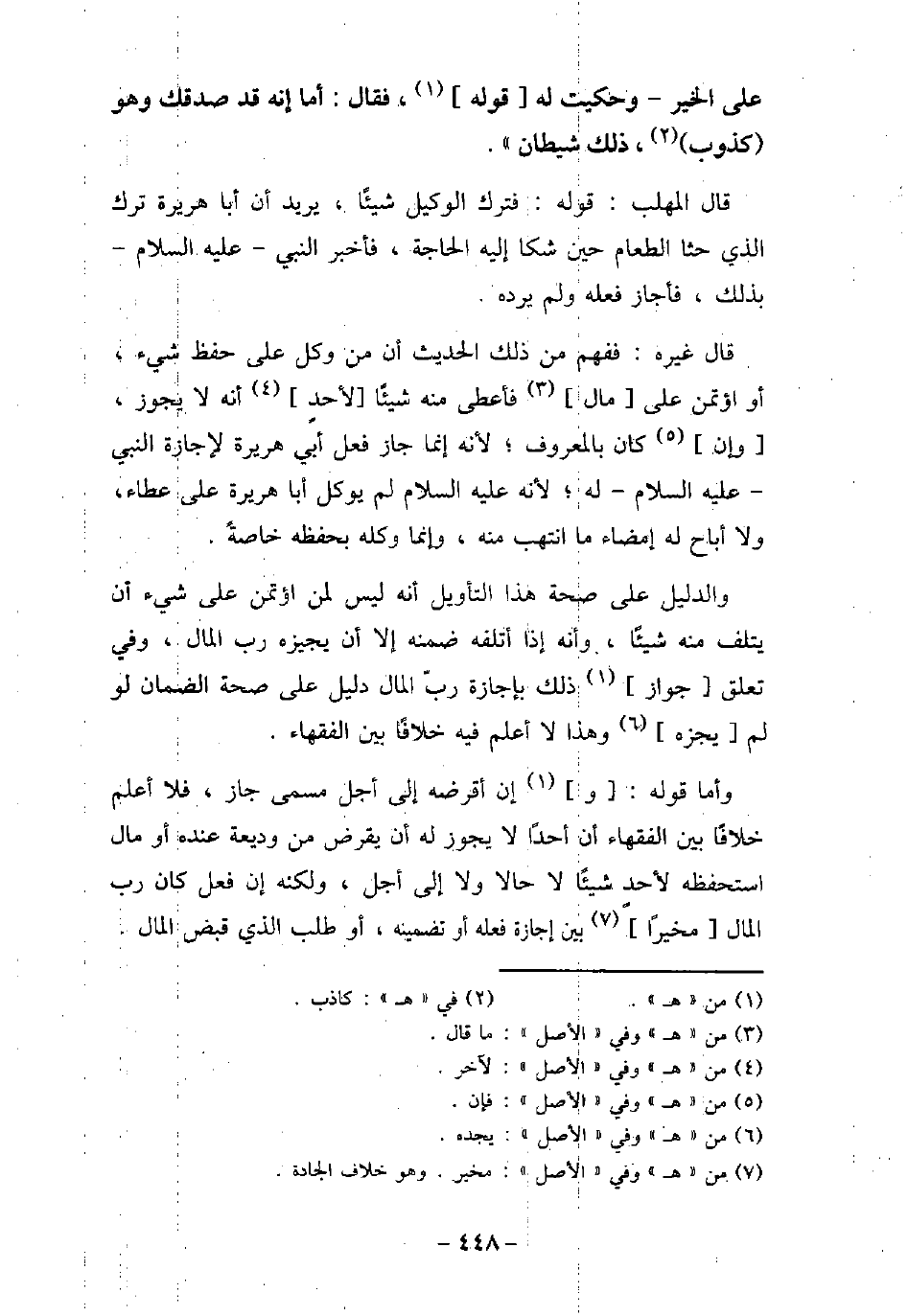 عَلَى الْخَيْرِ، وحكيت له القول، فَقَالَ النَّبىُّ (صلى الله عليه وسلم) : (أَمَا إِنَّهُ قَدْ صَدَقَكَ، وَهُوَ كَذُوبٌ (ذَاكَ شَيْطَانٌ) . قال المهلب: قوله: فترك الوكيل شيئًا، يريد أن أبا هريرة ترك الذى حثا الطعام حين شكا إليه الحاجة، فأخبر النبى - عليه السلام - بذلك، فأجاز فعله ولم يرده. قال غيره: ففهم من ذلك الحديث أن من وكل على حفظ شئ، أو أؤتمن على مال فأعطى منه شيئًا لأحد أنه لا يجوز، وإن كان بالمعروف، لأنه إنما جاز فعل أبى هريرة لأجازة النبى - عليه السلام - له، لأنه عليه السلام لم يوكل أبا هريرة على عطاء، ولا أباح له إمضاء ما انتهب منه، وإنما وكله بحفظه خاصة. والدليل على صحة هذا التأويل أنه ليس لمن أؤتمن على شىء أن يتلف منه شيئًا، وأنه إذا أتلفه ضمنه إلا أن يجيزه رب المال، وفى تعلق جواز ذلك بإجازة رب المال دليل على صحة الضمان لو لم يجزه وهذا لا أعلم فيه خلافاُ بين الفقهاء. وأما قوله: وإن أقرضه إلى أجل مسمى جاز، فلا أعلم خلافًا بين الفقهاء أن أحدًا لا يجوز له أن يقرض من وديعة عنده أو مال استحفظه لأحد شيئًا لا حالا ولا إلى أجل، ولكنه إن فعل كان رب المال مخيرًا بين إجازة فعله أو تضمينه، أو طلب الذى قبض المال.