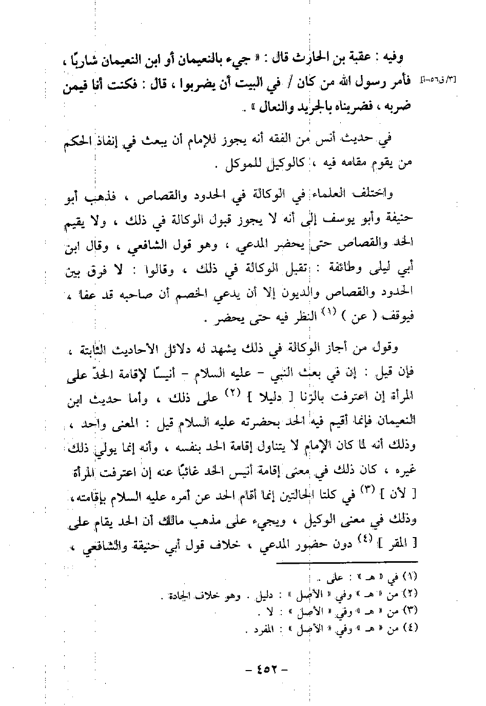 / 15 - وفيه: عُقْبَةَ بْنِ الْحَارِثِ، قَالَ: جِىءَ بِالنُّعَيْمَانِ، أَوِ ابْنِ النُّعَيْمَانِ شَارِبًا، فَأَمَرَ رَسُولُ اللَّهِ (صلى الله عليه وسلم) مَنْ كَانَ فِى الْبَيْتِ أَنْ يَضْرِبُوا، قَالَ: فَكُنْتُ أَنَا فِيمَنْ ضَرَبَهُ، فَضَرَبْنَاهُ بِالْجَرِيدِ والنِّعَالِ. فى حديث أنس من الفقه أنه يجوز للإمام أن يبعث فى إنفاذ الحكم من يقوم مقامه فيه، كالوكيل للموكل. واختلف العلماء فى الوكالة فى الحدود والقصاص، فذهب أبو حنيفة وأبو يوسف إلى أنه لا يجوز قبول الوكالة فى ذلك، ولا يقيم الحد والقصاص حتى يحضر المدعى، وهو قول الشافعى، وقال ابن أبى ليلى وطائفة: تقبل الوكالة فى ذلك، وقالوا: لا فرق بين الحدود والقصاص والديون إلا أن يدعى الخصم أن صاحبه قد عفا، فيوقف عن النظر فيه حتى يحضر. وقول من أجاز الوكالة فى ذلك يشهد له دلائل الأحاديث الثابتة، فإن قيل: إن فى بعث النبى - عليه السلام - أنيسًا لإقامة الحد على المرأة إن اعترفت بالزنا دليلاً على ذلك، وأما حديث ابن النعيمان فإنما أقيم فيه الحد بحضرته عليه السلام. قيل: المعنى واحد، وذلك أنه لما كان الإمام لا يتناول إقامة الحد بنفسه، وأنه إنما يولى ذلك غيره، كان ذلك فى معنى إقامة أنيس الحد غائبًا عنه إن اعترفت المرأة لأن فى كلتا الحالتين إنما أقام الحد عن أمره عليه السلام بإقامته، وذلك فى معنى الوكيل، ويجئ على مذهب مالك أن الحد يقام على المقر دون حضور المدعى، خلاف قول أبى حنيفة والشافعى،