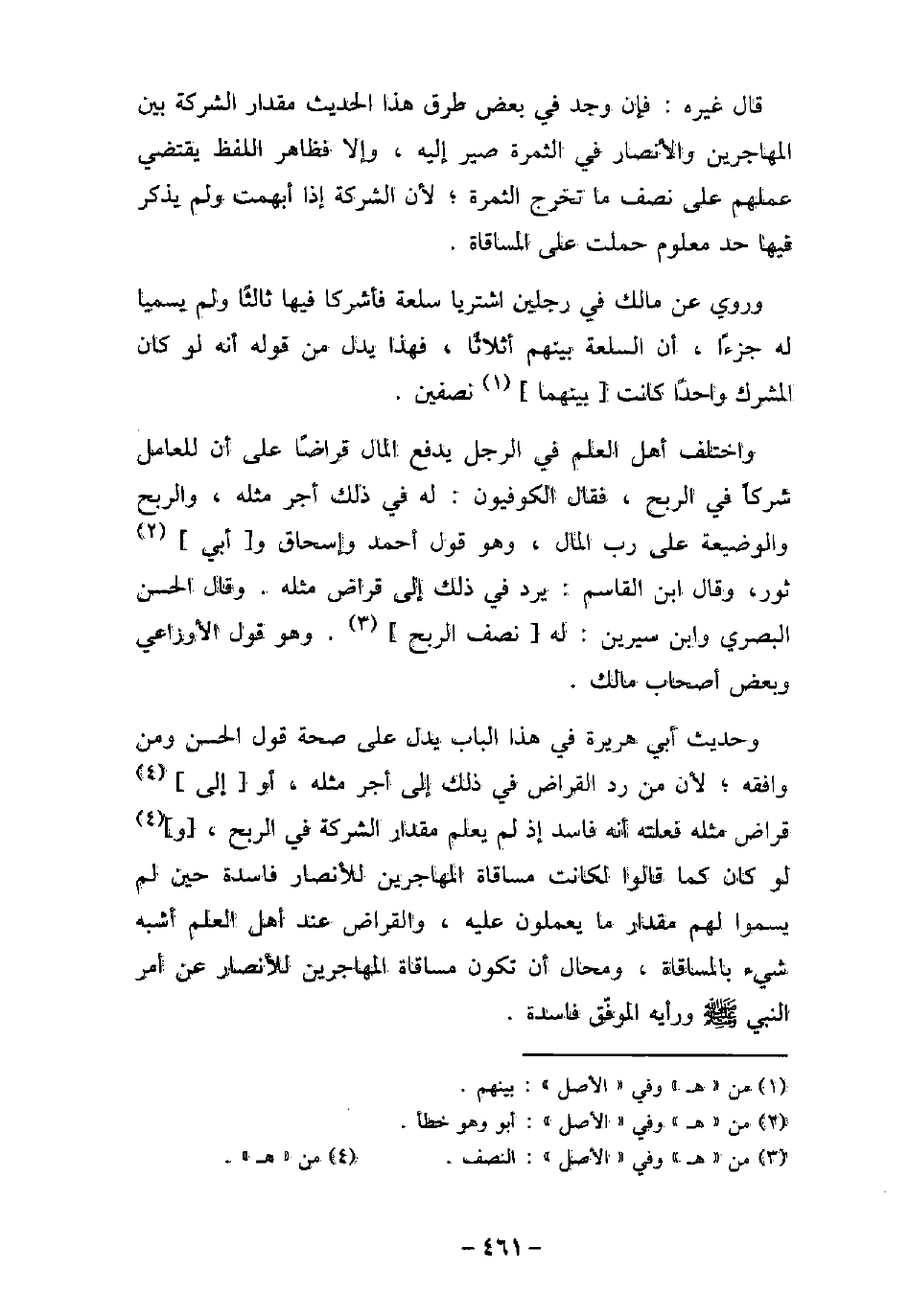 قال غيره: فإن وجد فى بعض طرق هذا الحديث مقدار الشركة بين المهاجرين والأنصار فى الثمرة صير إليه، وإلا فظاهر اللفظ يقتضى عملهم على نصف ما تخرج الثمرة، لأن الشركة إذا أبهمت ولم يذكر فيها حد معلوم حملت على المساقاة. وروى عن مالك فى رجلين اشتريا سلعة فأشركا فيها ثالثاُ ولم يسميا له جزءا، أن السلعة بينهم أثلاثًا، فهذا يدل من قوله أنه لو كان المشرك واحدًا كانت بينهما نصفين. واختلف أهل العلم فى الرجل يدفع المال قراضاُ على أن للعامل شركاُ فى الربح، فقال الكوفيون: له فى ذلك أجر مثله، والربح والوضيعة على رب المال، وهو قول أحمد وإسحاق وأبى ثور، وقال ابن القاسم: يرد فى ذلك إلى قراض مثله. وقال الحسن البصرى وابن سيرين: له نصف الربح. وهو قول الأوزاعى وبعض أصحاب مالك. وحديث أبى هريرة فى هذا الباب يدل على صحة قول الحسن ومن وافقه، لأن من رد القراض فى ذلك إلى أجر مثله، أو إلى قراض مثله فعلته أنه فاسد إذ لم يعلم مقدار الشركة فى الربح، ولو كان كما قالوا لكانت مساقاة المهاجرين للأنصار فاسدة حين لم يسموا لهم مقدار ما يعملون عليه، والقراض عند أهل العلم أشبه شىء بالمساقاة، ومحال أن تكون مساقاة المهاجرين للأنصار عن أمر النبى (صلى الله عليه وسلم) ورأيه الموفق فاسدة.
