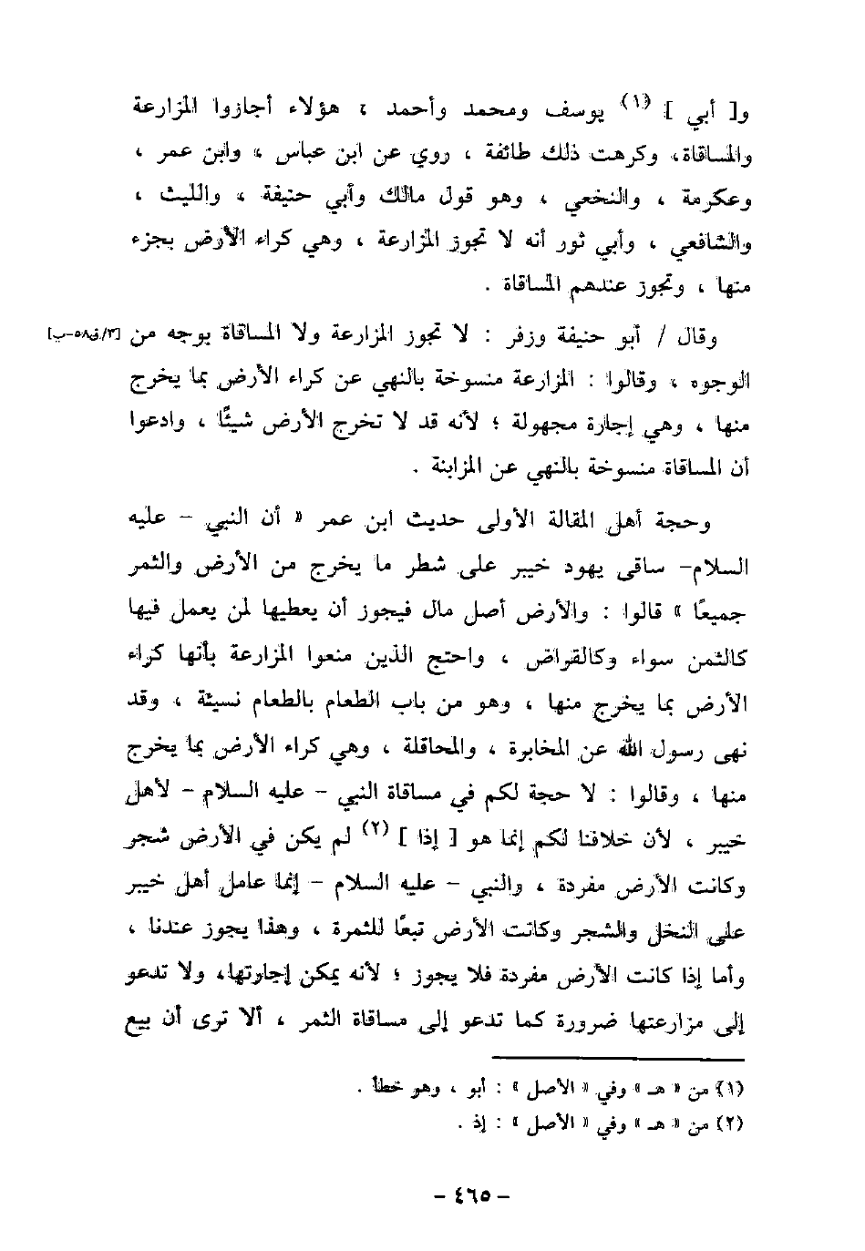 وأبى يوسف ومحمد وأحمد، هؤلاء أجازوا المزارعة والمساقاة، وكرهت ذلك طائفة، روى عن ابن عباس، وابن عمر، وعكرمة، والنخعى، وهو قول مالك وأبى حنيفة، والليث، والشافعى، وأبى ثور أنه لا تجوز المزارعة، وهى كراء الأرض بجزء منها، وتجوز عندهم المساقاة. وقال أبو حنيفة وزفر: لا تجوز المزارعة ولا المساقاة بوجه من الوجوه، وقالوا: المزارعة منسوخة بالنهى عن كراء الأرض بما يخرج منها، وهى إجارة مجهولة؛ لأنه قد لا تخرج الأرض شيئًا، وادعوا أن المساقاة منسوخة بالنهى عن المزابنة. وحجة أهل المقالة الأولى حديث ابن عمر: (أن النبى - عليه السلام - ساقى يهود خيبر على شطر ما يخرج من الأرض والثمر جميعًا) قالوا: والأرض أصل مال فيجوز أن يعطيها لمن يعمل فيها كالثمن سواء وكالقراض، واحتج الذين منعوا المزارعة بأنها كراء الأرض بما يخرج منها، وهو من باب الطعام بالطعام نسيئة، وقد نهى رسول الله عن المخابرة، والمحاقلة، وهى كراء الأرض بما يخرج منها، وقالوا: لا حجة لكم فى مساقاة النبى - عليه السلام - لأهل خيبر، لأن خلافنا لكم إنما هو إذا لم يكن فى الأرض شجر وكانت الأرض مفردة، والنبى - عليه السلام - إنما عامل أهل خيبر على النخل والشجر وكانت الأرض تبعًا للثمرة، وهذا يجوز عندنا، وأما إذا كانت الأرض مفردة فلا يجوز؛ لأنه يمكن إجارتها، ولا تدعو إلى مزارعتها ضرورة كما تدعو إلى مساقاة الثمر، ألا ترى أن بيع