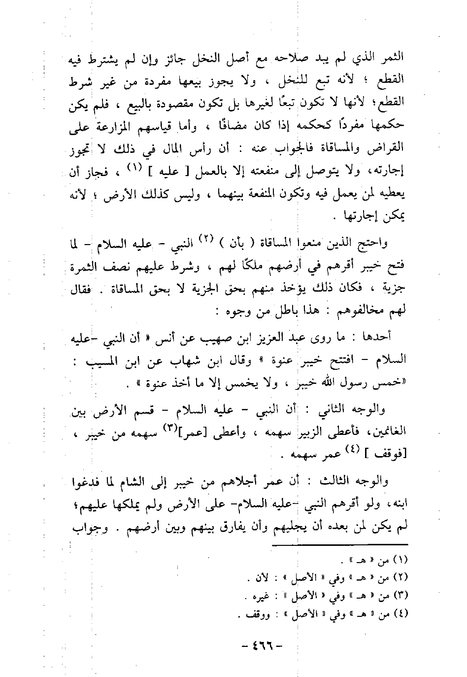 الثمر الذى لم يبد صلاحه من أصل النخل جائز وإن لم يشترط فيه القطع؛ لأنه تبع للنخل، ولا يجوز بيعها مفردة من غير شرط القطع؛ لأنها لا تكون تبعًا لغيرها بل تكون مقصودة بالبيع، فلم يكن حكمها مفردًا كحكمه إذا كان مضافًا، وأما قياسهم المزارعة على القراض والمساقاة فالجواب عنه: أن رأس المال فى ذلك لا تجوز إجارته، ولا يتواصل إلى منفعته إلا بالعمل عليه، فجاز أن يعطيه لمن يعمل فيه وتكون المنفعة بينهما، وليس كذلك الأرض؛ لأنه يمكن إجارتها. واحتج الذين منعوا المساقاة بأن النبى - عليه السلام - لما فتح خيبر أقرهم فى أرضهم ملكًا لهم، وشرط عليهم نصف الثمرة جزية، فكان ذلك يؤخذ منهم بحق الجزية لا بحق المساقاة. فقال لهم مخالفوهم: هذا باطل من وجوه. أحدها: ما روى عبد العزيز ابن صهيب عن أنس (أن النبى - عليه السلام - افتتح خيبر عنوة) وقال ابن شهاب عن ابن المسيب: (خمس رسول الله خيبر، ولا يخمس إلا ما أخذ عنوة) . والوجه الثانى: أن النبى - عليه السلام - قسم الأرض بين الغانمين، فأعطى الزبير سهمه، وأعطى عمر سهمه من خيبر، فوقف عمر سهمه. والوجه الثالث: أن عمر أجلاهم من خيبر إلى الشام لما فدغوا ابنه، ولو أقرهم النبى - عليه السلام - على الأرض ولم يملكها عليهم؛ لم يكن لمن بعده أن يجليهم وأن يفارق بينهم وبين أرضهم. وجواب