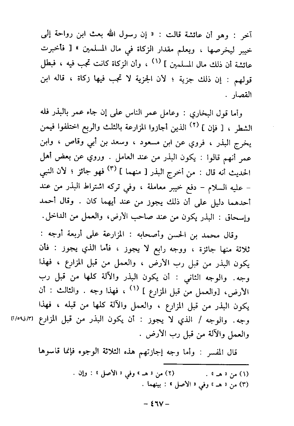 آخر: وهو أن عائشة قالت: (إن رسول الله بعث ابن رواحة إلى خيبر ليخرصها، ويعلم مقدار الزكاة فى مال المسلمين) ، فأخبرت عائشة أن ذلك مال المسلمين، وأن الزكاة كانت تجب فيه، فبطل قولهم: إن ذلك جزية؛ لأن الجزية لا تجب فيها زكاة، قاله ابن القصار. وأما قول البخارى: وعامل عمر الناس على إن جاء عمر بالبذر فله الشطر، فإن الذين أجازوا المزارعة بالثلث والربع اختلفوا فيمن يخرج البذر، فروى عن ابن مسعود، وسعد بن أبى وقاص، وابن عمر أنهم قالوا: يكون البذر من عند العامل. وروى عن بعض أهل الحديث أنه قال: من أخرج البذر منهما فهو جائز، لأن النبى - عليه السلام - دفع خيبر معاملة، وفى تركه اشتراط البذر من عند أحدهما دليل على أن ذلك يجوز من عند أيهما كان. وقال أحمد وإسحاق: البذر يكون من عند صاحب الأرض، والعمل من الداخل. وقال محمد بن الحسن وأصحابه: المزارعة على أربعة أوجه: ثلاثة منها جائزة، ووجه رابع لا يجوز، فأما الذى يجوز: فأن يكون البذر من قبل رب الأرض، والعمل من قبل المزارع، فهذا وجه. والوجه الثانى: أن يكون البذر والآلة كلها من قبل رب الأرض، والعمل من قبل المزارع، فهذا وجه. والثالث: أن يكون البذر من قبل المزارع، والعمل والآلة كلها من قبله، فهذا وجه. والوجه الذى لا يجوز: أن يكون البذر من قبل المزارع والعمل والآلة من قبل رب الأرض. قال المفسر: وأما وجه إجازتهم هذه الثلاثة الوجوه فإنما قاسوها