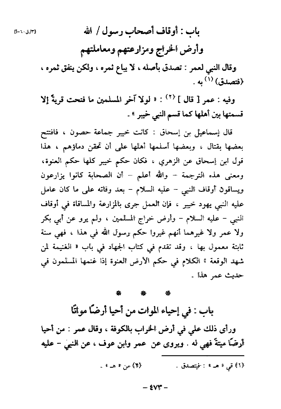- بَاب أَوْقَافِ أَصْحَابِ رسُول اللَّه (صلى الله عليه وسلم) وَأَرْضِ الْخَرَاجِ وَمُزَارَعَتِهِمْ وَمُعَامَلَتِهِمْ