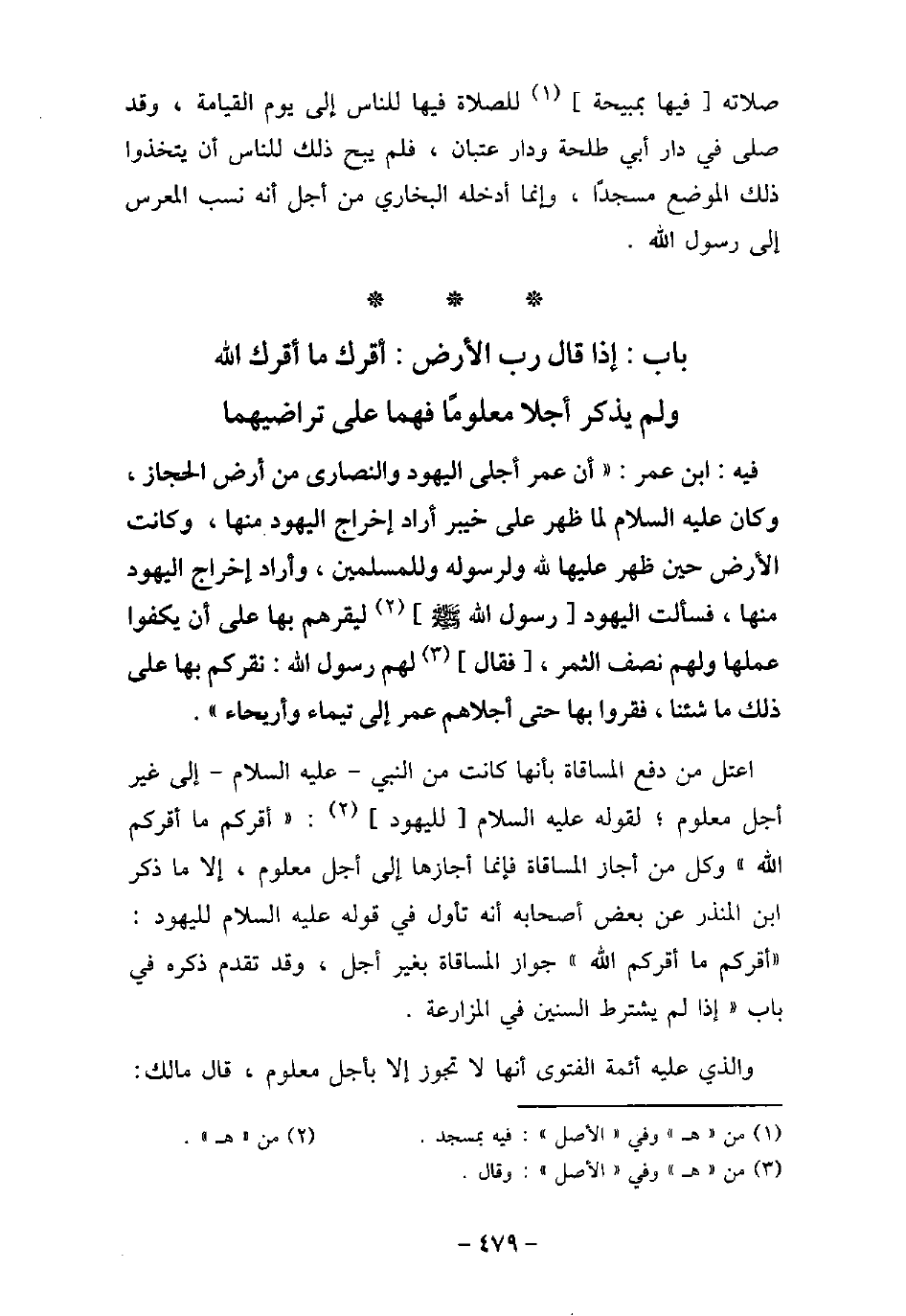 / 16 - فيه: ابْن عُمَرَ، أَنَّ عُمَرَ أَجْلَى الْيَهُودَ وَالنَّصَارَى مِنْ أَرْضِ الْحِجَازِ، وَكَانَ عليه السَّلام لَمَّا ظَهَرَ عَلَى خَيْبَرَ أَرَادَ إِخْرَاجَ الْيَهُودِ مِنْهَا، وَكَانَتِ الأَرْضُ حِينَ ظَهَرَ عَلَيْهَا لِلَّهِ وَلِرَسُولِهِ وَلِلْمُسْلِمِينَ، وَأَرَادَ إِخْرَاجَ الْيَهُودِ مِنْهَا، فَسَأَلَتِ الْيَهُودُ رَسُولَ اللَّهِ (صلى الله عليه وسلم) لِيُقِرَّهُمْ بِهَا أَنْ يَكْفُوا عَمَلَهَا، وَلَهُمْ نِصْفُ الثَّمَرِ، فَقَالَ لَهُمْ رَسُولُ اللَّهِ (صلى الله عليه وسلم) : (نُقِرُّكُمْ بِهَا عَلَى ذَلِكَ مَا شِئْنَا) ، فَقَرُّوا بِهَا حَتَّى أَجْلاَهُمْ عُمَرُ إِلَى تَيْمَاءَ، وَأَرِيحَاءَ. اعتل من دفع بأنها كانت من النبى - عليه السلام - إلى غير أجل معلوم، لقوله عليه السلام لليهود: (أقركم ما أقركم الله) وكل من أجاز المساقاة فإنما أجازها إلى أجل معلوم، إلا ما ذكر ابن المنذر عن بعض أصحابه أنه تأول فى قوله عليه السلام لليهود: (أقركم ما أقركم الله) جواز المساقاة بغير أجل، وقد تقدم ذكره فى باب (إذا لم يشترط السنين فى المزارعة) . والذى عليه أئمة الفتوى أنها لا تجوز إلا بأجل معلوم، قال مالك: