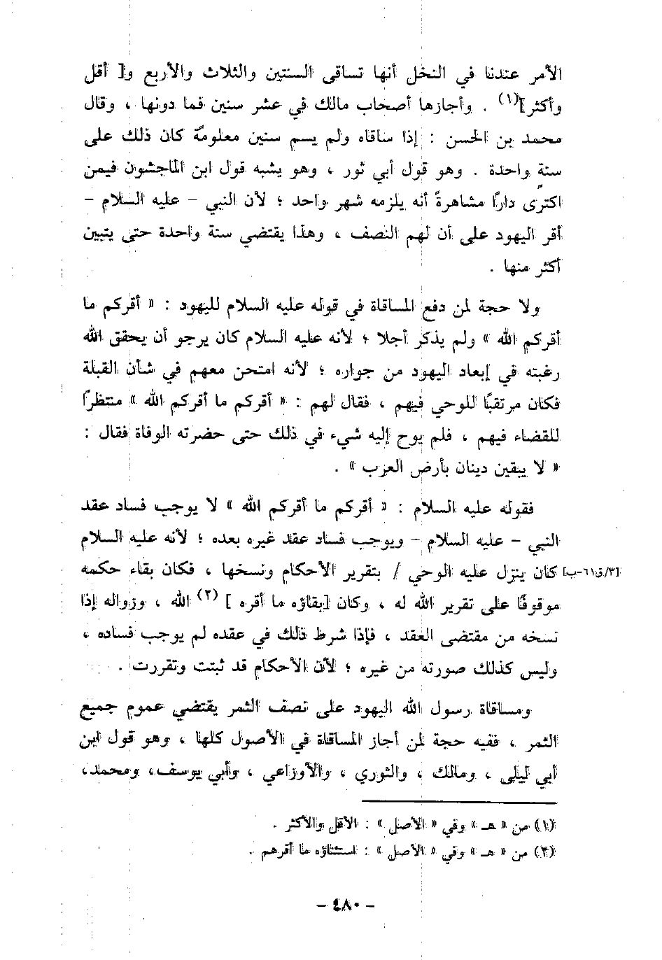 الأمر عندنا فى النخل أنها تساقى السنتين والثلاث والأربع وأقل وأكثر. وأجازها أصحاب مالك فى عشر سنين فما دونها، وقال محمد بن الحسن: إذا ساقاه ولم يسم سنين معلومة كان ذلك على سنة واحدة. وهو قول أبى ثور، وهو يشبه قول ابن الماجشون فيمن اكترى دارًا مشاهرة أنه يلزمه شهر واحد، لأن النبى - عليه السلام - أقر اليهود على أن لهم النصف، وهذا يقتضى سنة واحدة حتى يتبين أكثر منها. ولا حجة لمن دفع المساقاة فى قوله عليه السلام لليهود: (أقركم ما أقركم الله) ، ولم يذكر أجلا، لأنه عليه السلام كان يرجو أن يحقق الله رغبته فى إبعاد اليهود من جواره، لأنه امتحن معهم فى شأن القبلة فكان مرتقبًا للوحى فيهم، فقال لهم: (أقركم ما أقركم الله) منتظراُ للقضاء فيهم، فلم يوح إليه فى ذلك حتى حضرته الوفاة فقال: (لا يبقين دينان بأرض العرب) . فقوله عليه السلام: (أقركم ما أقركم الله) لا يوجب فساد عقد النبى - عليه السلام - ويوجب فساد عقد غيره بعده، لأنه عليه السلام كان ينزل عليه الوحى بتقرير الأحكام ونسخها، فكان بقاء حكمة موقوفًا على تقرير الله له، وكان بقاؤه ما أقره الله، وزواله إذا نسخه من مقتضى العقد، فإذا شرط ذلك فى عقده لم يوجب فساده، وليس كذلك صورته من غيره، لأن الأحكام قد ثبتت وتقررت. ومساقاة رسول الله اليهود على نصف الثمر يقتضى عموم جميع الثمر، ففيه حجة لمن أجاز المساقاة فى الأصول كلها، وهو قول ابن أبى ليلى، ومالك، والثورى، والأوزاعى، وأبى يوسف، ومحمد،