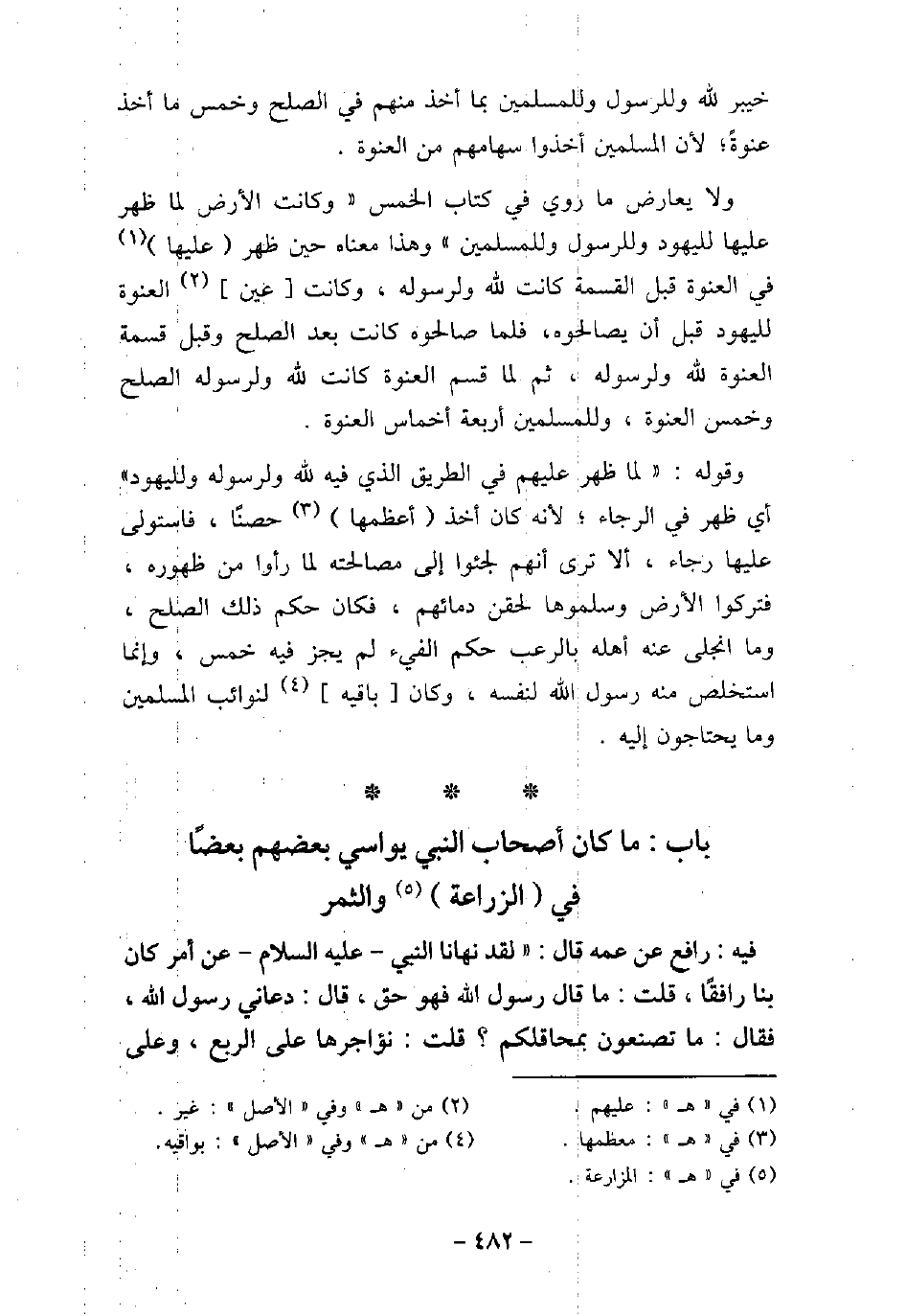 خيبر لله وللرسول وللمسلمين بما أخذ منهم فى الصلح وخمس ما أخذ عنوة، لأن المسلمين أخذوا سهامهم من العنوة. ولا يعارض ما روى فى كتاب الخمس (وكانت الأرض لما ظهر عليها لليهود وللرسول وللمسلمين) وهذا معناه حين ظهر عليها فى العنوة قبل القسمة كانت لله ولرسوله، وكانت عين العنوة لليهود قبل أن يصالحوه، فلما صالحوه كانت بعد الصلح وقبل قسمة العنوة لله ولرسوله، ثم لما قسم العنوة كانت لله ولرسوله الصلح وخمس العنوة، وللمسلمين أربعة أخماس العنوة. وقوله: (لما ظهر عليهم فى الطريق الذى فيه لله ولرسوله ولليهود) ، أى ظهر فى الرجاء؛ لأنه كان أخذ أعظمها حصنًا، فاستولى عليها رجاء، ألا ترى أنهم لجئوا إلى مصالحته لما رأوا من ظهوره، فتركوا الأرض وسلموها لحقن دمائهم، فكان حكم ذلك الصلح، وما انجلى عنه أهله بالرعب حكم الفىء لم يجز فيه خمس، وإنما استخلص منه رسول الله لنفسه، وكان باقيه لنوائب المسلمين وما يحتاجون إليه.