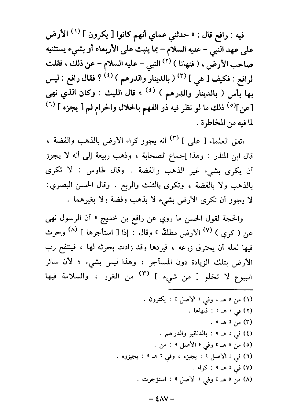 / 19 - فيه: رَافِع، قَالَ: حَدَّثَنِى عَمَّاىَ أَنَّهُمْ كَانُوا يُكْرُونَ الأَرْضَ عَلَى عَهْدِ النَّبِىِّ عليه السلام، بِمَا يَنْبُتُ عَلَى الأَرْبِعَاءِ، أَوْ بِشَىْءٍ يَسْتَثْنِيهِ صَاحِبُ الأَرْضِ، فَنَهَانا النَّبِىُّ، عليه السَّلام، عَنْ ذَلِكَ، فَقُلْتُ لِرَافِعٍ: فَكَيْفَ هِىَ بِالدِّينَارِ وَالدِّرْهَمِ؟ فَقَالَ رَافِعٌ: لَيْسَ بِهَا بَأْسٌ بِالدِّينَارِ وَالدِّرْهَمِ. قَالَ اللَّيْثُ: وَكَانَ الَّذِى نُهِىَ عَنْ ذَلِكَ، مَا لَوْ نَظَرَ فِيهِ ذَوُو الْفَهْمِ بِالْحَلاَلِ وَالْحَرَامِ، لَمْ يُجِيزُوهُ لِمَا فِيهِ مِنَ الْمُخَاطَرَةِ. اتفق العلماء على أنه يجوز كراء الأرض بالذهب والفضة، قال ابن المنذر: وهذا إجماع الصحابة، وذهب ربيعة إلى أنه لا يجوز أن يكرى بشىء غير الذهب والفضة. وقال طاوس: لا تكرى بالذهب ولا بالفضة، وتكرى بالثلث والربع. وقال الحسن البصرى: لا يجوز أن تكرى الأرض بشىء لا بذهب وفضة ولا بغيرهما. والحجة لقول الحسن ما روى عن رافع بن خديج (أن الرسول نهى عن كرى الأرض مطلقًا) ، وقال: إذا استأجرها وحرث فيها لعله أن يحترق زرعه، فيردها وقد زادت بحرثه لها، فينتفع رب الأرض بتلك الزيادة دون المستأجر، وهذا ليس بشىء، لأن سائر البيوع لا تخلو من شىء من الغرر، والسلامة فيها