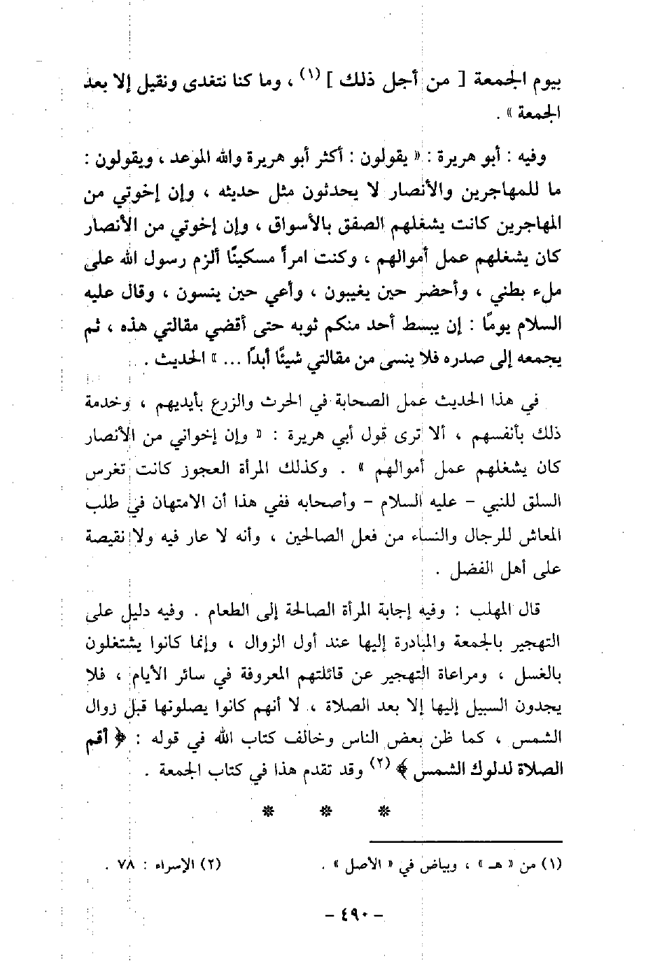 بِيَوْمِ الْجُمُعَةِ مِنْ أَجْلِ ذَلِكَ، وَمَا كُنَّا نَتَغَدَّى، وَلاَ نَقِيلُ إِلاَ بَعْدَ الْجُمُعَةِ. / 22 - وفيه: أَبُو هُرَيْرَةَ، يَقُولُونَ: أكثر أَبَا هُرَيْرَةَ، وَاللَّهُ الْمَوْعِدُ، وَيَقُولُونَ: مَا لِلْمُهَاجِرِينَ وَالأَنْصَارِ لاَ يُحَدِّثُونَ مِثْلَ حديثه، وَإِنَّ إِخْوَتِى مِنَ الْمُهَاجِرِينَ كَانَتْ يَشْغَلُهُمُ الصَّفْقُ بِالأَسْوَاقِ، وَإِنَّ إِخْوَتِى مِنَ الأَنْصَارِ كَانَ يَشْغَلُهُمْ عَمَلُ أَمْوَالِهِمْ، وَكُنْتُ امْرًَا مِسْكِينًا أَلْزَمُ رَسُولَ اللَّهِ (صلى الله عليه وسلم) عَلَى مِلْءِ بَطْنِى، وَأَحْضُرُ حِينَ يَغِيبُونَ، وَأَعِى حِينَ يَنْسَوْنَ، وَقَالَ عليه السَّلام يَوْمًا: (إن يَبْسُطَ أَحَدٌ مِنْكُمْ ثَوْبَهُ حَتَّى أَقْضِىَ مَقَالَتِى هَذِهِ، ثُمَّ يَجْمَعَهُ إِلَى صَدْرِهِ، فَلا يَنْسَى مِنْ مَقَالَتِى شَيْئًا أَبَدًا. . . .) ، الحديث. فى هذا الحديث عمل الصحابة فى الحرث والزرع بأيديهم، وخدمة ذلك بأنفسهم، ألا ترى قول أبى هريرة: (وإن إخوانى من الأنصار كان يشغلهم عمل أموالهم) ، وكذلك المرأة العجوز كانت تغرس السلق للنبى - عليه السلام - وأصحابه ففى هذا أن الامتهان فى طلب المعاش للرجال والنساء من فعل الصالحين، وأنه لا عار فيه ولا نقيصة على أهل الفضل. قال المهلب: وفيه إجابة المرأة الصالحة إلى الطعام. وفيه دليل على التهجير بالجمعة والمبادرة إليها عند أول الزوال، وإنما كانوا يشغلون بالغسل، ومراعاة التهجير عن قائلتهم المعروفة فى سائر الأيام، فلا يجدون السبيل إليها إلا بعد الصلاة، لا أنهم كانوا يصلونها قبل زوال الشمس، كما ظن بعض الناس وخالف كتاب الله فى قوله: (أقم الصلاة لدلوك الشمس (وقد تقدم هذا فى كتاب الجمعة.