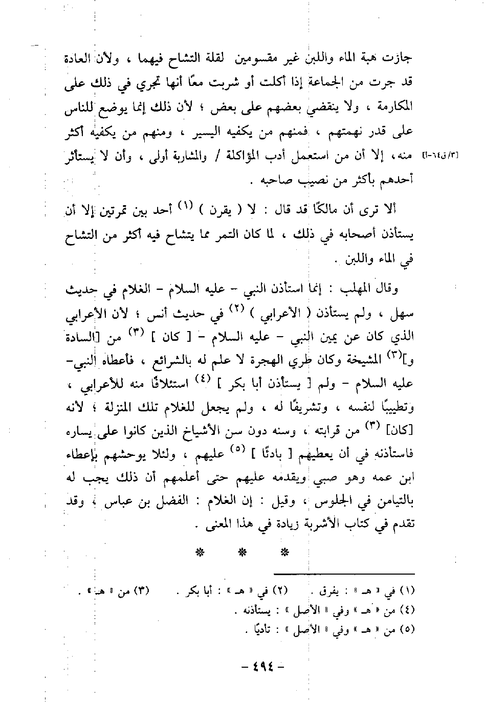 جازت هبة الماء واللبن غير مقسومين لقلة التشاح فيهما، ولأن العادة قد جرت من الجماعة إذا أكلت أو شربت معًا أنها تجرى فى ذلك على المكارمة، ولا ينقضى بعضهم على بعض، لأن ذلك إنما يوضع للناس على قدر نهمتهم، فمنهم من يكفيه اليسير، ومنهم من يكفيه أكثر منه، إلا أن من استعمل أدب المؤاكلة والمشاربة أولى، وأن لا يستأثر أحدهم بأكثر من نصيب صاحبه. ألا ترى أن مالكًا قد قال: لا يقرن أحد بين تمرتين إلا أن يستأذن أصحابه فى ذلك، لما كان التمر مما يتشاح فيه أكثر من التشاح فى الماء واللبن. وقال المهلب: إنما استأذن النبى - عليه السلام - الغلام فى حديث سهل، ولم يستأذن الأعرابى فى حديث أنس، لأن الأعرابى الذى كان عن يمين النبى - عليه السلام - كان من السادة والمشيخة وكان طرى الهجرة لا علم له بالشرائع، فأعطاه النبى - عليه السلام - ولم يستأذن أبا بكر استئلافًا منه للأعرابى، وتطييبًا لنفسه، وتشريفاُ له، ولم يجعل للغلام تلك المنزلة، لأنه كان من قرابته، وسنه دون سن الأشياخ الذين كانوا على يساره فاستأذنه فى أن يعطيهم بادئًا عليهم، ولئلا يوحشهم بإعطاء ابن عمه وهو صبى ويقدمه عليهم حتى أعلمهم أن ذلك يجب له بالتيامن فى الجلوس، وقيل: إن الغلام: الفضل بن عباس، وقد تقدم فى كتاب الأشربة زيادة فى هذا المعنى.