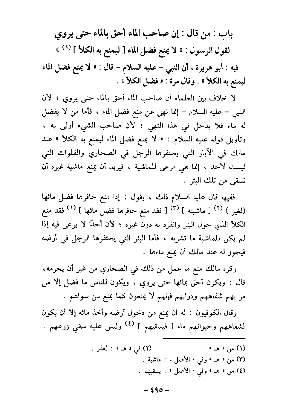 / 3 - فيه: أَبُو هُرَيْرَةَ، أَنَّ النَّبِىّ، عليه السَّلام، قَالَ: (لاَ يُمْنَعُ فَضْلُ الْمَاءِ، لِيُمْنَعَ بِهِ الْكَلأَ) . وَقَالَ مرة: (فَضْلُ الْكَلأَ) . لا خلاف بين العلماء أن صاحب الماء أحق بالماء حتى يروى، لأن النبى - عليه السلام - إنما نهى عن منع فضل الماء، فأما من لا يفضل له ماء فلا يدخل فى هذا النهى، لأن صاحب الشىء أولى به، وتأويل قوله عليه السلام: (لا يمنع فضل الماء ليمنع به الكلأ) عند مالك فى الآبار التى يحتفرها الرجل فى الصحارى والفلوات التى ليست لأحد، إنما هى مرعى للماشية، فيريد أن يمنع ماشية غيره أن تسقى من تلك البئر. ففيها قال عليه السلام ذلك، يقول: إذا منع حافرها فضل مائها لغير ماشيته فقد منع حافرها فضل مائها فقد منع الكلأ الذى حول البئر وانفرد به دون غيره، لأن أحدًا لا يرعى فيه إذا لم يكن للماشية ما تشربه، فأما البئر التى يحتفرها الرجل فى أرضه فيجوز له عند مالك أن يمنع ماءها. وكره مالك منع ما عمل من ذلك فى الصحارى من غير أن يحرمه، قال: ويكون أحق بمائها حتى يروى، ويكون للناس ما فضل إلا من مر بهم شفاههم ودوابهم فإنهم لا يمنعون كما يمنع من سواهم. وقال الكوفيون: له أن يمنع من دخول أرضه وأخذ مائه إلا أن يكون لشفاههم وحيوانهم ماء فيسقيهم وليس عليه سقى زرعهم.
