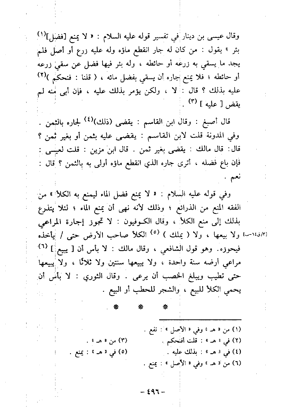وقال عيسى بن دينار فى تفسير قوله عليه السلام: (لا يمنع فضل بئر) يقول: من كان له جار انقطع ماؤه وله عليه زرع أو أصل فلم يجد ما يسقى به زرعه أو حائطه، وله بئر فيها فضل عن سقى زرعه أو حائطه، فلا يمنع جاره أن يسقى بفضل مائه، قلنا: فنحكم عليه بذلك؟ قال: لا، ولكن يؤمر بذلك عليه، فإن أبى منه لم يقض عليه. قال أصبغ: وقال ابن القاسم: يقضى ذلك لجاره بالثمن. وفى المدونة قلت لابن القاسم: يقضى عليه بثمن أو بغير ثمن؟ قال: قال مالك: يقضى بغير ثمن. قال ابن مزين: قلت لعيسى: فإن باع فضله، أترى جاره الذى انقطع ماؤه أولى به بالثمن؟ قال: نعم. وفى قوله عليه السلام: (لا يمنع فضل الماء ليمنع به الكلأ) من الفقه المنع من الذرائع، وذلك لأنه نهى أن يمنع الماء، لئلا يتذرع بذلك إلى منع الكلأ، وقال الكوفيون: لا تجوز إجارة المراعى ولا بيعها، ولا يملك الكلأ صاحب الأرض حتى يأخذه فيحوزه. وهو قول الشافعى، وقال مالك: لا بأس أن يبيع مراعى أرضه سنة واحدة، ولا يبيعها سنتين ولا ثلاثًا، ولا يبيعها حتى تطيب ويبلغ الخصب أن يرعى. وقال الثورى: لا بأس أن يحمى الكلأ للبيع، والشجر للحطب أو البيع.
