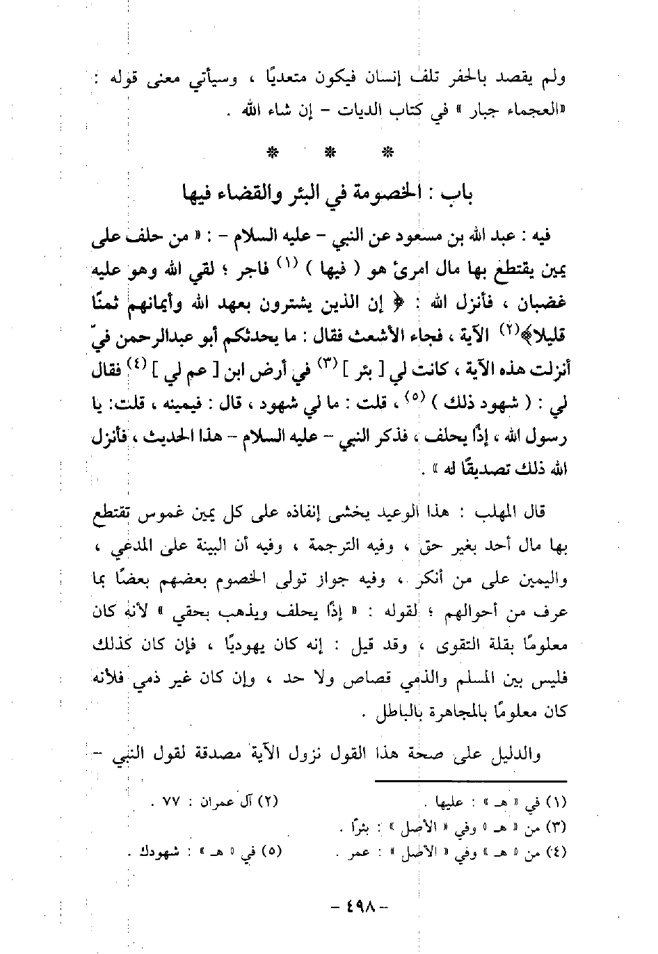 / 5 - فيه: عَبْدِاللَّهِ بن مسعود، عَنِ النَّبِىِّ، عليه السَّلام، قَالَ: (مَنْ حَلَفَ عَلَى يَمِينٍ يَقْتَطِعُ بِهَا مَالَ امْرِئٍ هُوَ فَيْهَا فَاجِرٌ، لَقِىَ اللَّهَ وَهُوَ عَلَيْهِ غَضْبَانُ) ، فَأَنْزَلَ اللَّهُ: (إِنَّ الَّذِينَ يَشْتَرُونَ بِعَهْدِ اللَّهِ وَأَيْمَانِهِمْ ثَمَنًا قَلِيلاً (الآيَةَ، فَجَاءَ الأَشْعَثُ، فَقَالَ: مَا يُحَدَّثَكُمْ أَبُو عَبْدِالرَّحْمَنِ فِىَّ أُنْزِلَتْ هَذِهِ الآيَةُ كَانَتْ لِى بِئْرٌ فِى أَرْضِ ابْنِ عَمٍّ لِى، فَقَالَ لِى: (شُهُود ذَلِكَ) ، قُلْتُ: مَا لِى شُهُودٌ، قَالَ: (فَيَمِينُهُ) ، قُلْتُ: يَا رَسُولَ اللَّهِ، إِذًا يَحْلِفَ فَذَكَرَ النَّبِىُّ، عليه السَّلام، هَذَا الْحَدِيثَ، فَأَنْزَلَ اللَّهُ ذَلِكَ تَصْدِيقًا لَهُ. قال المهلب: هذا الوعيد يخشى إنفاذه على كل يمين غموس تقتطع بها مال أحد بغير حق، وفيه الترجمة، وفيه أن البينة على المدعى، واليمين على من أنكر، وفيه جواز تولى الخصوم بعضهم بعضًا بما عرف من أحوالهم؛ لقوله: (إذا يحلف ويذهب بحقى) لأنه كان معلومًا بقلة التقوى، وقد قيل: إنه كان يهوديًا، فإن كان كذلك فليس بين المسلم والذمى قصاص ولا حد، وإن كان غير ذمى فلأنه كان معلومًا بالمجاهرة بالباطل. والدليل على صحة هذا القول نزول الآية مصدقة لقوله النبى -