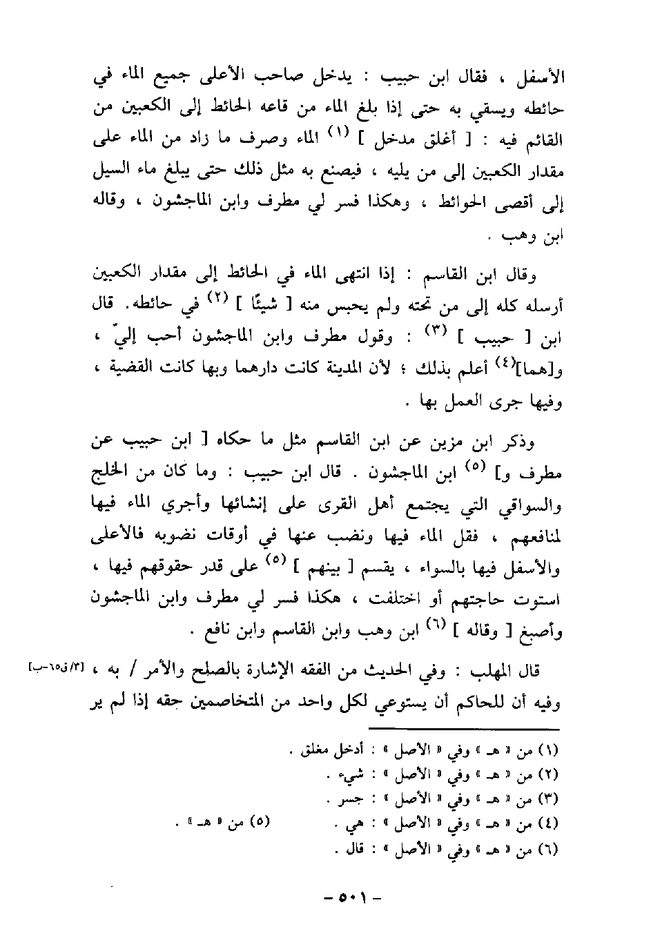 الأسفل، وترجم له شرب الأعلى إلى الكعبين إلى: (حتى يرتفع إلى الجدر واستوعى له حقه. . .) الحديث. قال ابن شهاب: فقدرت الأنصار والناس قول النبى - عليه السلام -: (اسق ثم احبس حتى يرتفع إلى الجدر) ، فكان ذلك إلى الكعبين. اختلف أصحاب مالك فى صفة إرسال الماء الأعلى إلى الأسفل، فقال ابن حبيب: يدخل صاحب الأعلى جميع الماء فى حائطه ويسقى به إذا بلغ الماء من قاعه الحائط إلى الكعبين من القائم فيه: أغلق مدخل الماء وصرف ما زاد من الماء على مقدار الكعبين إلى من يليه، فيصنع به مثل ذلك حتى يبلغ ماء السيل إلى أقصى الحوائط، وهكذا فسر لى مطرف وابن الماجشون، وقاله ابن وهب. وقال ابن القاسم: إذا انتهى الماء فى الحائط إلى مقدار الكعبين أرسله كله إلى من تحته ولم يحبس منه شيئًا فى حائطه. قال ابن حبيب: وقول مطرف وابن الماجشون أحب إلى، وهما أعلم بذلك، لأن المدينة كانت دارهما وبها كانت القضية، وفيها جرى العمل بها. وذكر ابن مزين عن ابن القاسم مثل ما حكاه ابن حبيب عن مطرف وابن الماجشون. قال ابن حبيب: وما كان من الخلج والسواقى التى يجتمع أهل القرى على إنشائها وأجرى الماء فيها لمنافعهم، فقل الماء فيها ونضب عنها فى أوقات نضوبه فالأعلى والأسفل فيها بالسواء، يقسم بينهم على قدر حقوقهم فيها، استوت حاجتهم أو اختلفت، هكذا فسر لى مطرف وابن الماجشون وأصبغ وقاله ابن وهب وابن القاسم وابن نافع. قال المهلب: وفى الحديث من الفقه الإشارة بالصلح والأمر به، وفيه أن للحاكم أن يستوعى لكل واحد من المتخاصمين حقه إذا لم ير