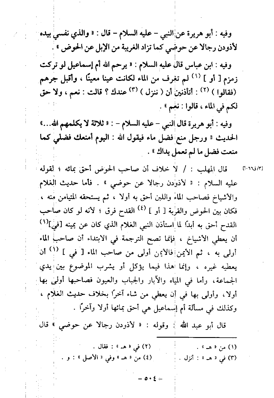 وفيه: أَبُو هُرَيْرَةَ، عَنِ النَّبِىِّ، عليه السَّلام، قَالَ: (وَالَّذِى نَفْسِى بِيَدِهِ، لاَذُودَنَّ رِجَالاً عَنْ حَوْضِى، كَمَا تُذَادُ الْغَرِيبَةُ مِنَ الإِبِلِ عَنِ الْحَوْضِ) . / 12 - وفيه: ابْن عَبَّاس، قَالَ عليه السَّلام: (يَرْحَمُ اللَّهُ أُمَّ إِسْمَاعِيلَ لَوْ تَرَكَتْ زَمْزَمَ، أَوْ لَوْ لَمْ تَغْرِفْ مِنَ الْمَاءِ، لَكَانَتْ عَيْنًا مَعِينًا، وَأَقْبَلَ جُرْهُمُ فَقَالُوا: أَتَأْذَنِينَ أَنْ نَنْزِلَ عِنْدَكِ، قَالَتْ: نَعَمْ، وَلاَ حَقٌ لكُمْ فِى الْمَاء قالوا: نَعَمْ. / 13 - وفيه: أَبُو هُرَيْرَةَ، قَالَ النَّبِىِّ عليه السَّلام: (ثَلاَثَةٌ لاَ يُكَلِّمُهُمُ اللَّهُ. . . . . . - الحديث - وَرَجُلٌ مَنَعَ فَضْلَ مَاءٍ، فَيَقُولُ اللَّهُ: الْيَوْمَ أَمْنَعُكَ فَضْلِى كَمَا مَنَعْتَ فَضْلَ مَا لَمْ تَعْمَلْ يَدَاكَ) . قال المهلب: لا خلاف أن صاحب الحوض أحق بمائه، لقوله عليه السلام: (لأذودن رجالا عن حوضى) . فأما حديث الغلام والأشياخ فصاحب الماء واللبن أحق به أولا، ثم يستحقه المتيامن منه، فكان بين الحوض والقربه أو القدح فرق، لأنه لو كان صاحب القدح أحق به أبدًا لما استأذن النبى الغلام الذى كان عن يمينه فى أن يعطى الأشياخ، فإنما تصح الترجمة فى الابتداء أن صاحب الماء أولى به، ثم الأيمن فالأيمن أولى من صاحب الماء فى أن يعطيه غيره، وإنما هذا فيما يؤكل أو يشرب الموضوع بين يدى الجماعة، وأما فى المياه والآبار والجباب والعيون فصاحبها أولى بها أولا، وأولى بها فى أن يعطى من شاء آخراُ بخلاف حديث الغلام، وكذلك فى مسألة أم إسماعيل هى أحق بمائها أولا وآخرًا. قال أبو عبد الله: وقوله: (لأذودن رجالا عن حوضى) قال