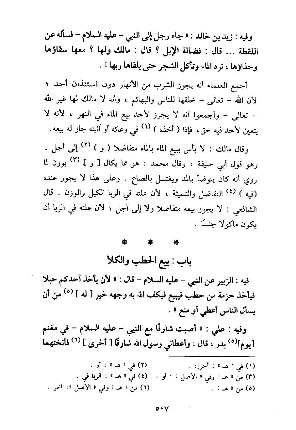 / 16 - وفيه: زَيْدِ بْنِ خَالِدٍ، جَاءَ رَجُلٌ إِلَى النَّبِىّ، عليه السَّلام، فَسَأَلَهُ عَنِ اللُّقَطَةِ. . . . . قَالَ: فَضَالَّةُ الإِبِلِ؟ قَالَ: (مَا لَكَ وَلَهَا، مَعَهَا سِقَاؤُهَا وَحِذَاؤُهَا، تَرِدُ الْمَاءَ، وَتَأْكُلُ الشَّجَرَ حَتَّى يَلْقَاهَا رَبُّهَا) . أجمع العلماء أنه يجوز الشرب من الأنهار دون استئذان أحد، لأن الله - تعالى - خلقها للناس والبهائم، وأنه لا مالك لها غير الله - تعالى - وأجمعوا أنه لا يجوز لأحد بيع الماء فى النهر، لأنه لا يتعين لأحد فيه حق، فإذا أخذه فى وعائه أو آنيته جاز له بيعه. وقال مالك: لا بأس ببيع الماء بالماء متفاضلا وإلى أجل وهو قول أبى حنيفة، وقال محمد: هو مما يكال ويوزن لما روى أنه كان يتوضأ بالمد ويغتسل بالصاع. وعلى هذا لا يجوز عنده فيه التفاضل والنسيئة، لأن علته فى الربا الكيل والوزن. قال الشافعى: لا يجوز بيعه متفاضلا ولا إلى أجل، لأن علته فى الربا أن يكون مأكولا جنسًا.