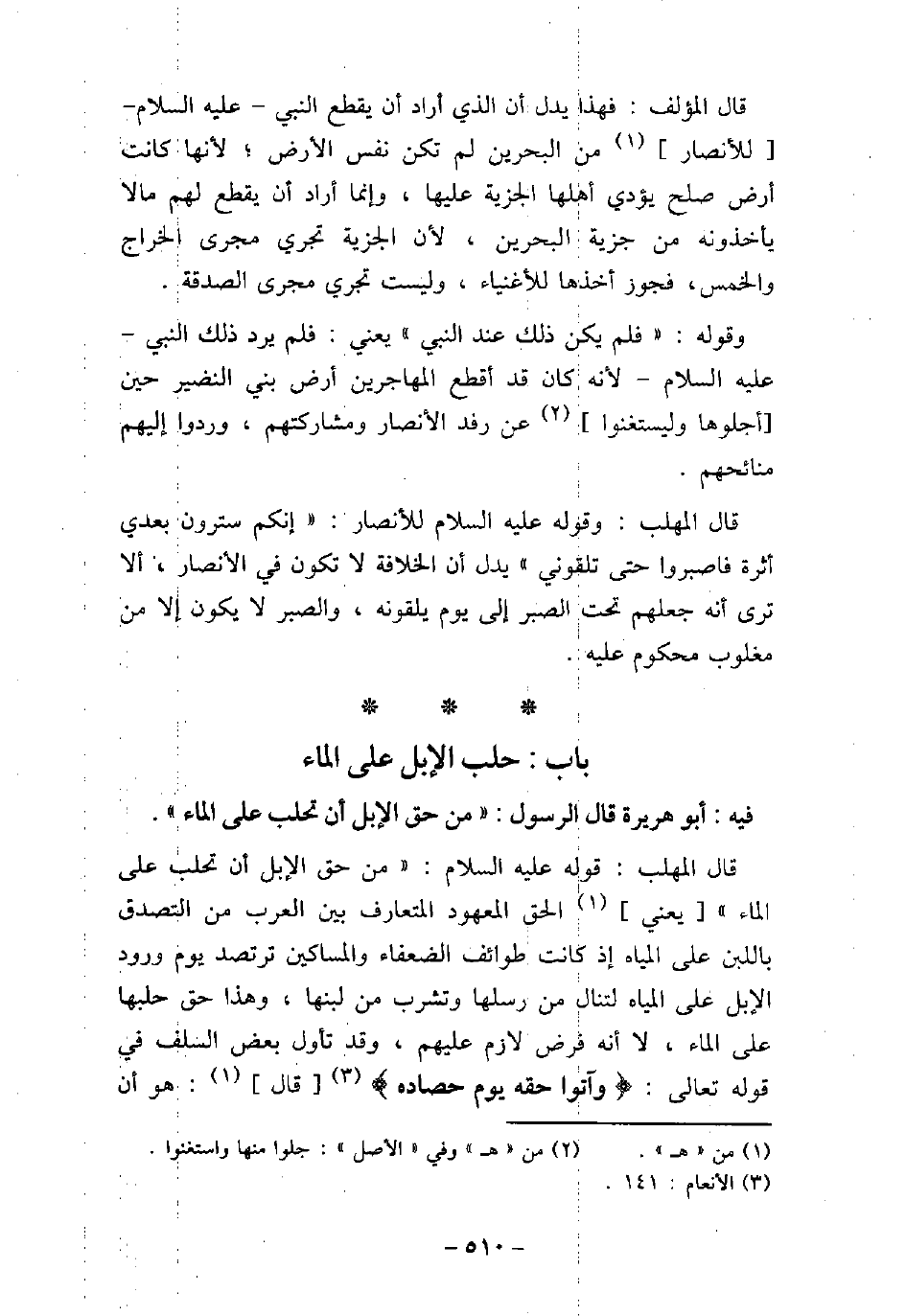 / 20 - فيه: أَبُو هُرَيْرَةَ، قَالَ الرسول (صلى الله عليه وسلم) : (مِنْ حَقِّ الإِبِلِ أَنْ تُحْلَبَ عَلَى الْمَاءِ) . قال المهلب: قوله عليه السلام: (من حق الإبل أن تحلب على الماء) يعنى الحق المعهود المتعارف بين العرب من التصدق باللبن على المياه إذ كانت طوائف الضعفاء والمساكين ترتصد يوم ورود الإبل على المياه لتنال من رسلها وتشرب من لبنها، وهذا حق حلبها على الماء، لا أنه فرض لازم عليهم، وقد تأول بعض السلف فى قوله تعالى: (وآتوا حقه يوم حصاده (قال: هو أن